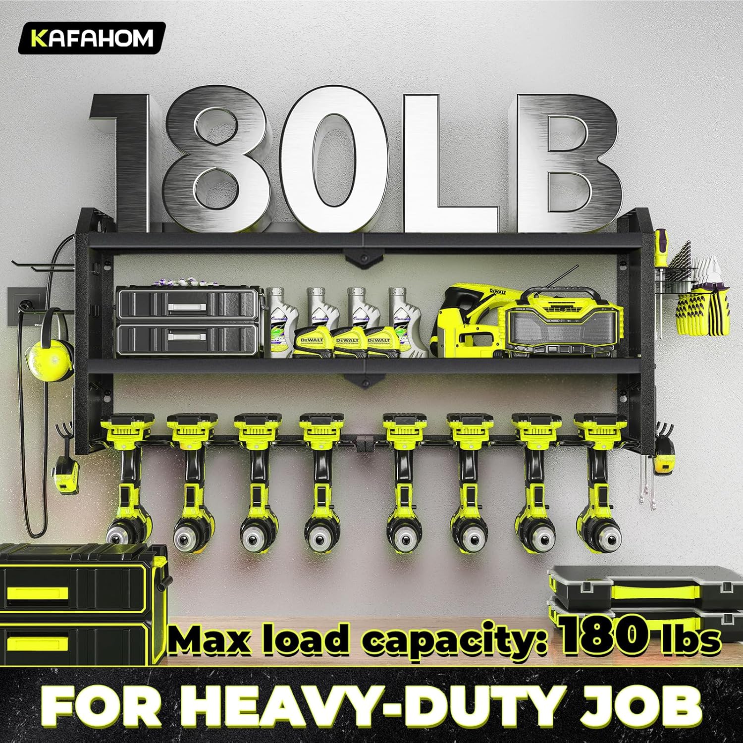 - Robust Construction: Built to last, KAFAHOM tool box organizers and storage wall mount features a sturdy alloy frame and reinforced double-layered metal plates for exceptional load-bearing capacity. It's the ideal utility cordless drill holder for a wide range of tools and accessories.
