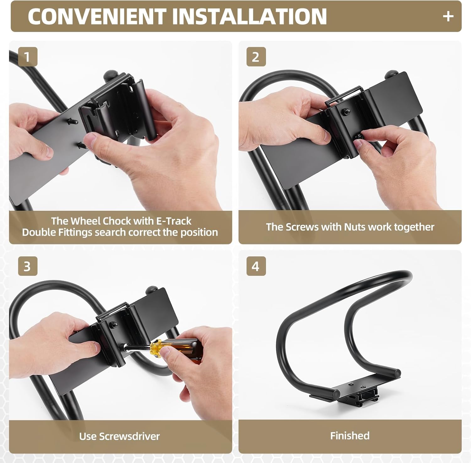 - .Versatile Design: Our E-Track Motorcycle Wheel Chock is designed to accommodate a wide range of motorcycle sizes and types without causing any damage to interior walls. It's a perfect fit for various bikes and even offers removable motorcycle wheel chocks for trailers. Please note that tie-down straps are still essential for secure road transportation.