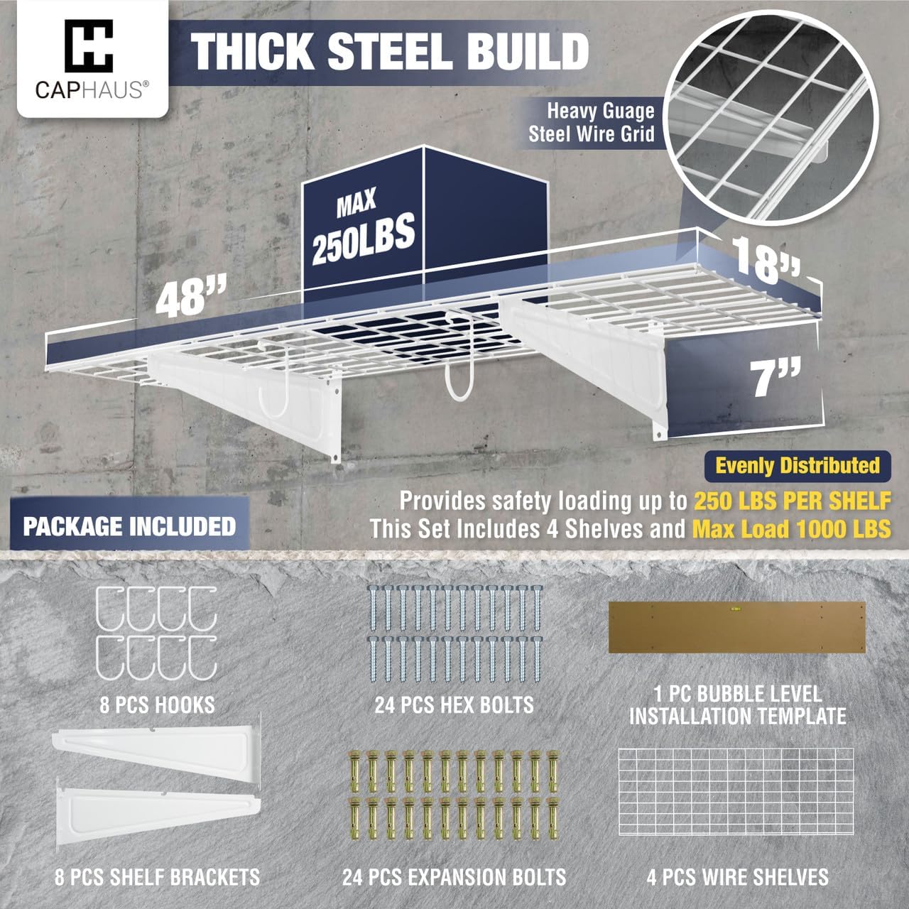 - 🔨 Various Size Choices - This option includes FOUR wall shelves, EIGHT Versatile hooks, and all necessary hardware. Each shelf measures 48 inches in width and 18 inches in depth, providing a total of 192 inches in width. Opt for the silver hex bolt for concrete and wooden walls and choose the golden expansion bolt for secure installation on brick walls. Heavy gauge steel construction provides safety loading up to 250lbs total per shelf, this set providing a total weight capacity of 1000 lbs.