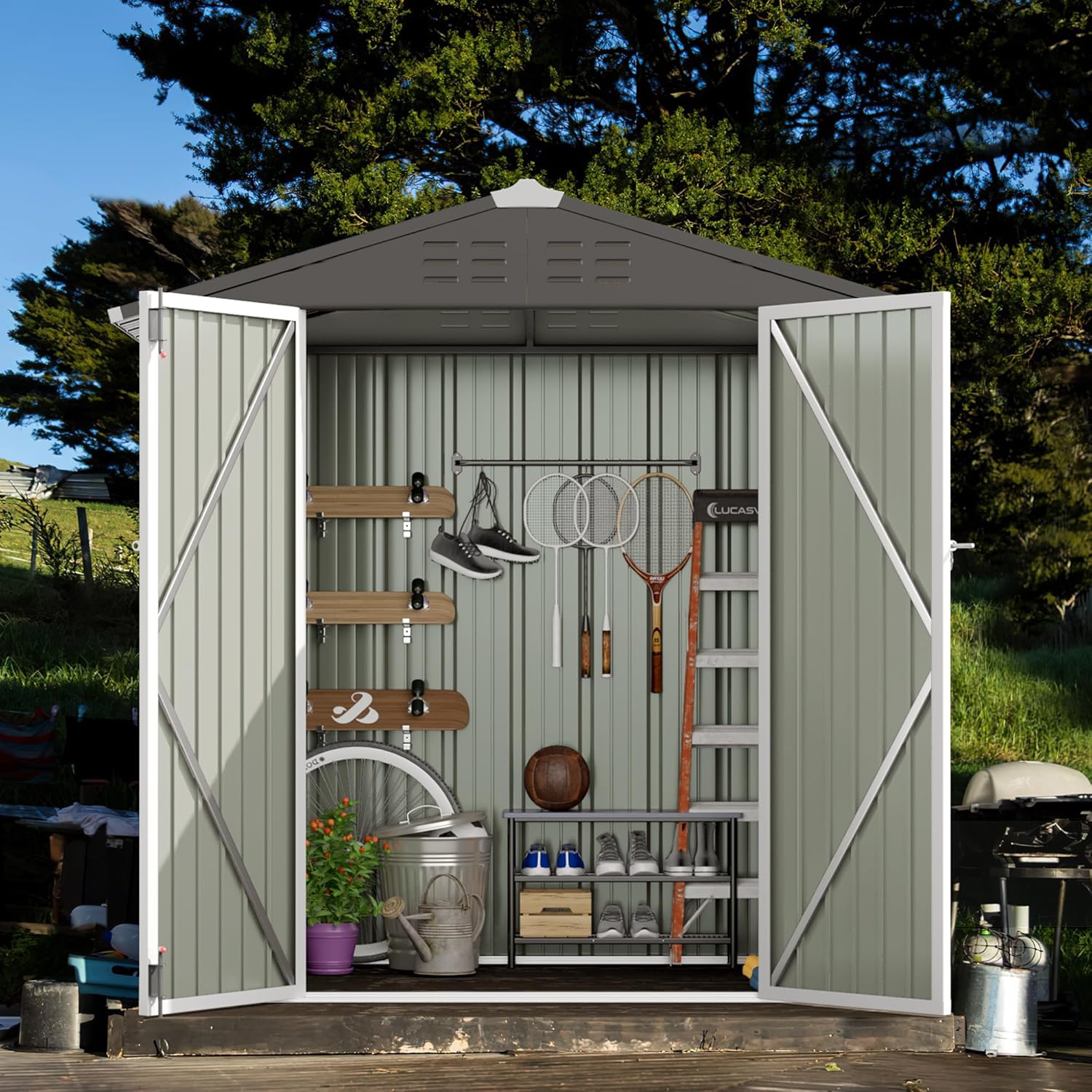 - Multifunctional storage shed: 6’*8’ Storage shed has 245cu.ft storage capacity can be used for multiple purposes, suitable for backyard, garden, courtyard, and other scenarios. It can be used to store tools, bicycles, garbage, and as a pet room.