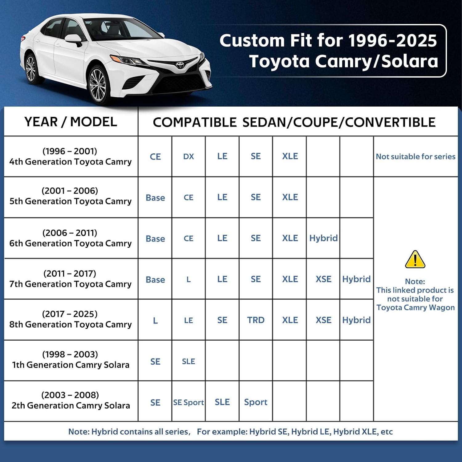 - 【Perfect Fit】— Holthly has conducted experiments to obtain a customized car cover specifically designed for Toyota Camry (1996-2025). The custom-like fit of the full cover not only enhances the -aesthetics of your vehicle but also provides superior wind resistance, thereby prolonging the lifespan of the hood. It offers enhanced and long-lasting protection for your car.
