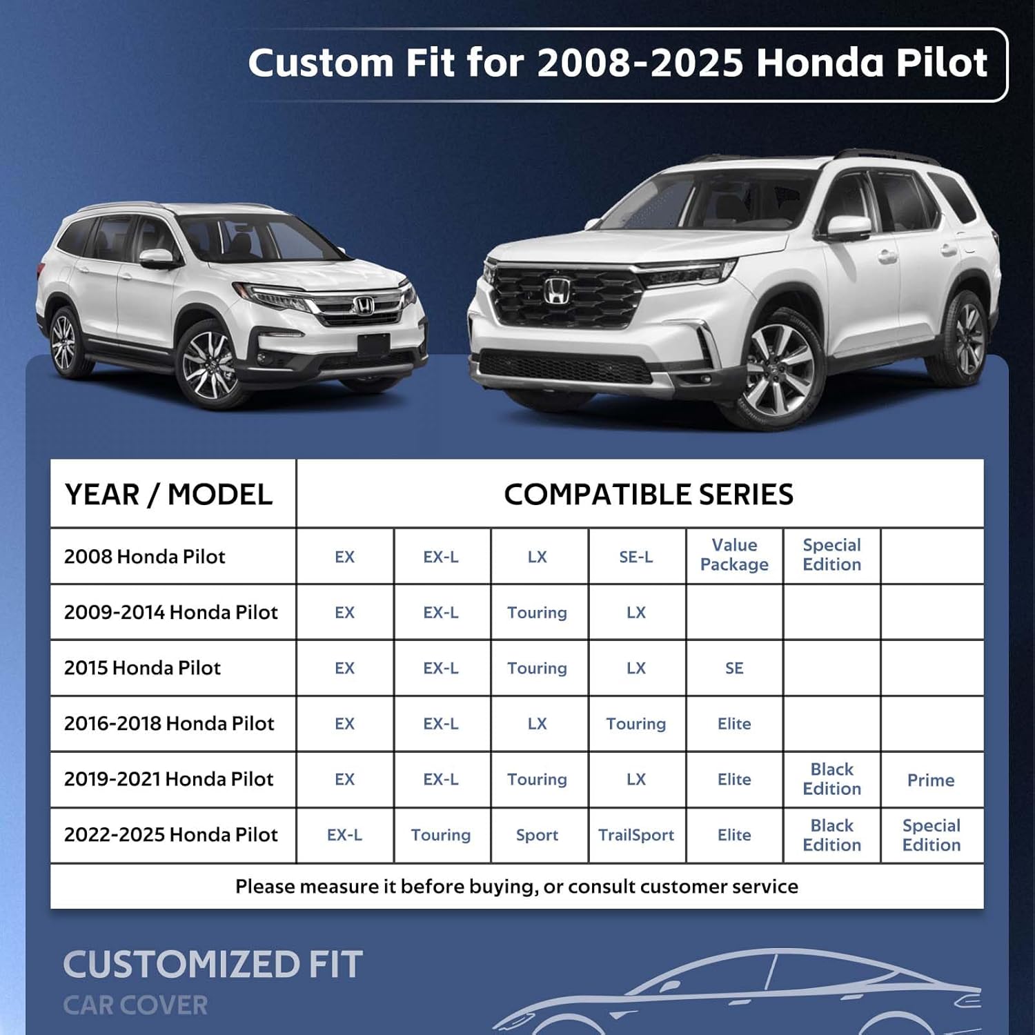 - 【Perfect Fit】— Holthly has conducted experiments to obtain a customized car cover specifically designed for Honda Pilot (2008-2024). The custom-like fit of the full cover not only enhances the -aesthetics of your vehicle but also provides superior wind resistance, thereby prolonging the lifespan of the hood. It offers enhanced and long-lasting protection for your car.