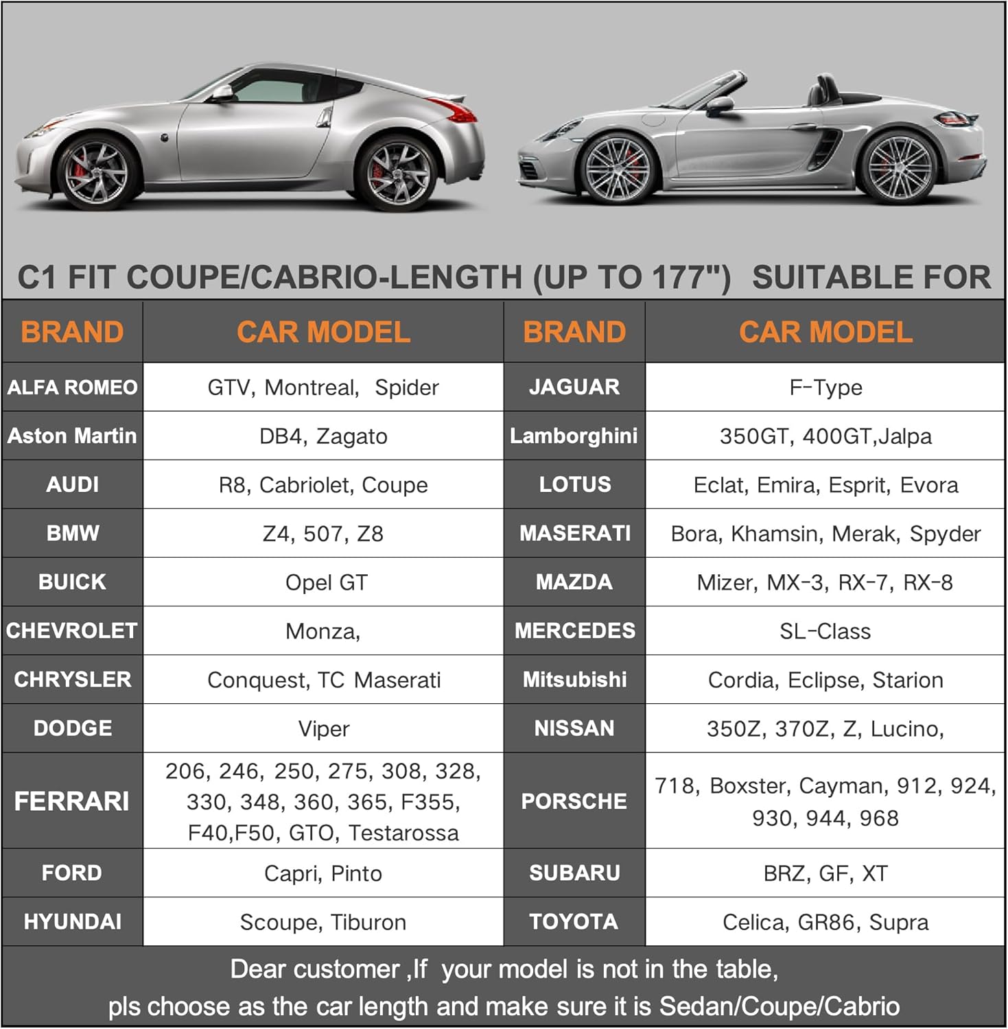 - 【Dimension C1】Universal fit for Coupe/sedan which length is 177 inch (Not for hatchback and SUV). Suitable Porsche 718 Cayman Boxster, Nissan 350Z 370Z, Jaguar F Type, Subaru BRZ, Toyota 86, Etc.