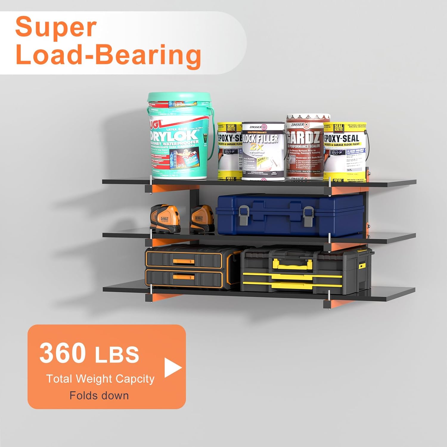 - 3-LEVEL WALL-MOUNTED WOOD STORAGE RACK: Lumber storage rack for organization garage are intricately welded industrially and come complete with drywall anchors and high-strength screw kits. Lumber storage rack orange arms are 16 inches long. Suitable for various walls, such as concrete walls, wooden walls, red brick walls, etc