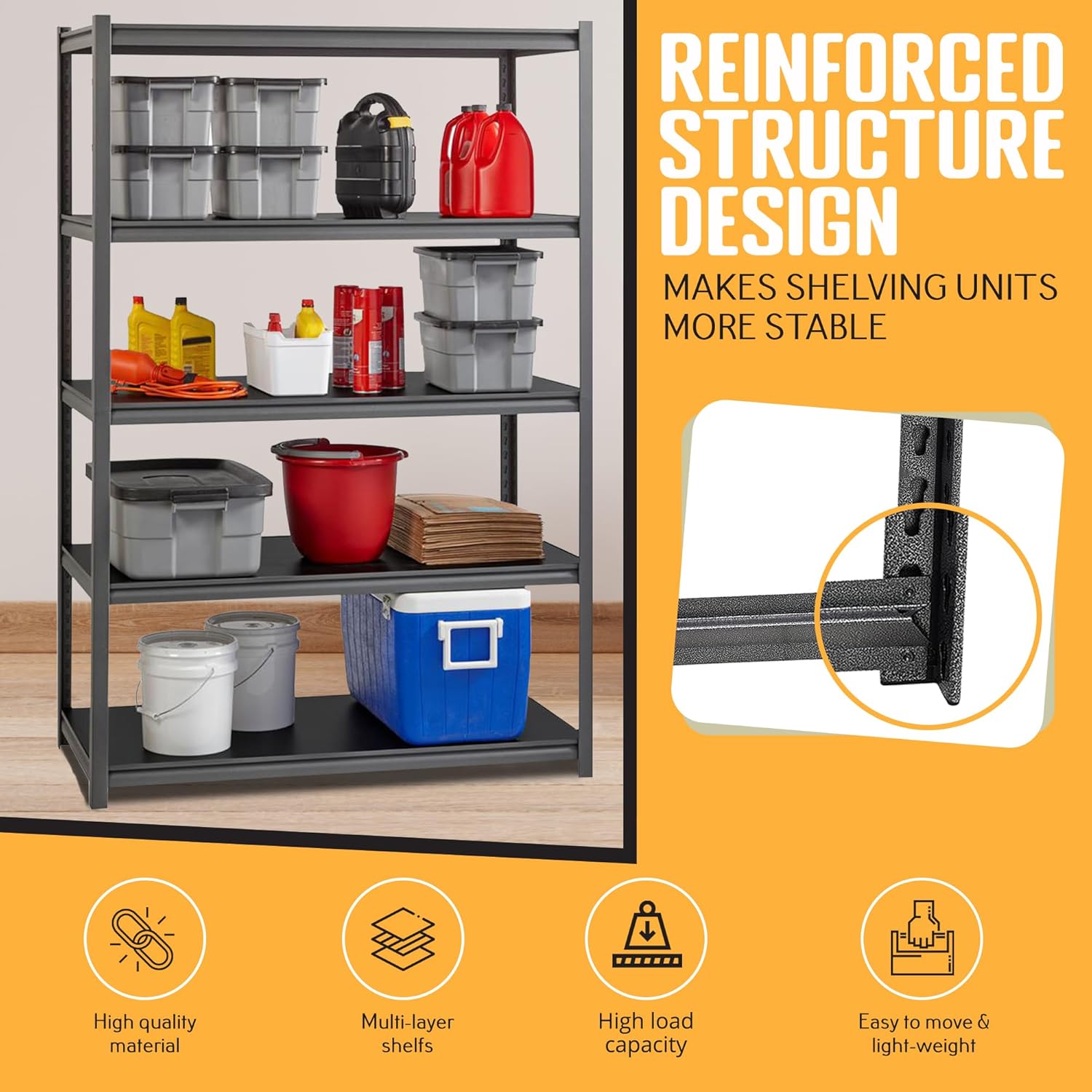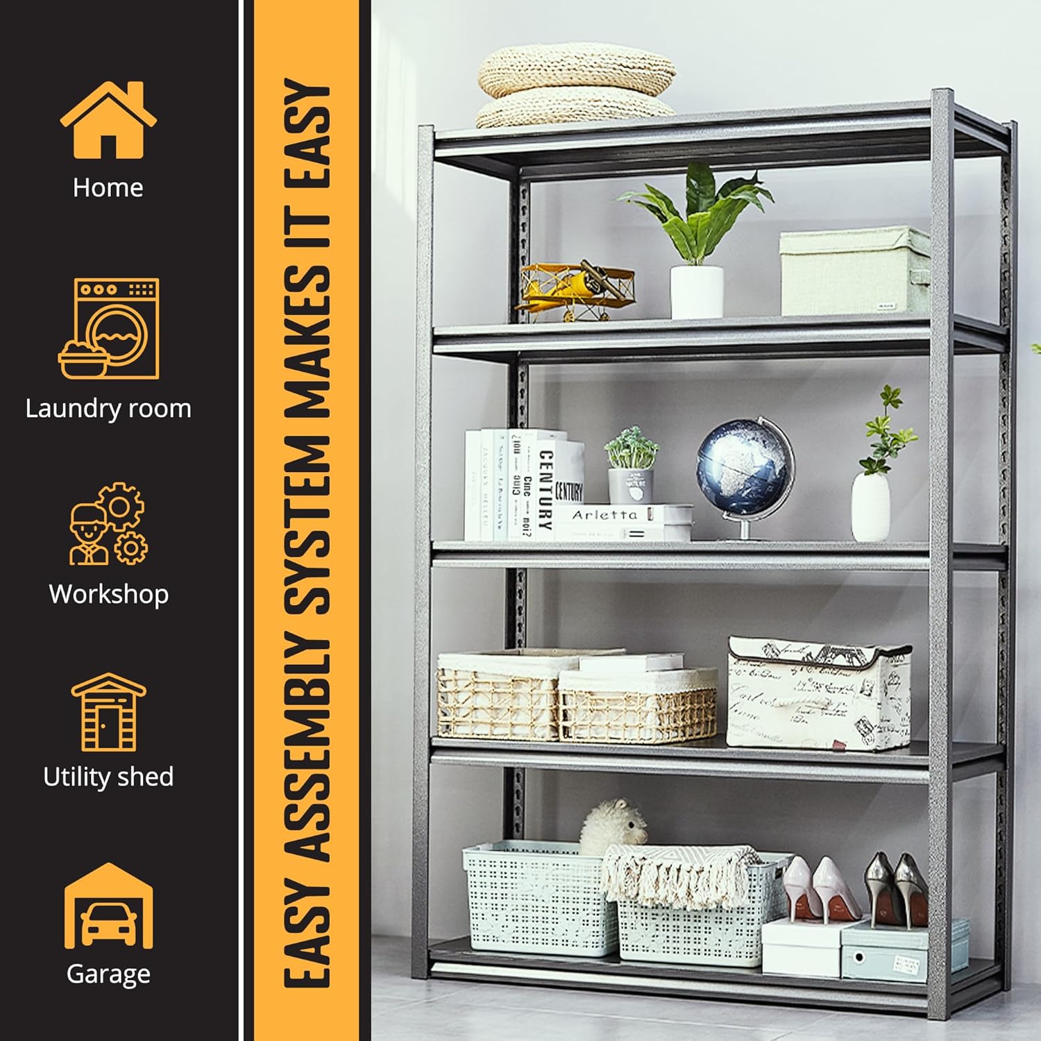 - âś… MULTIPURPOSE SHELVES - The heavy-duty steel shelving unit can be used in many places such as your garage, kitchen, offices, warehouses, yard, living room, pantry, bedroom, basement, shed, workplace, and much more. It can also be used for many occasions such as storing your accessories, boxes, products, tools, organizers, books, cases, and much more!