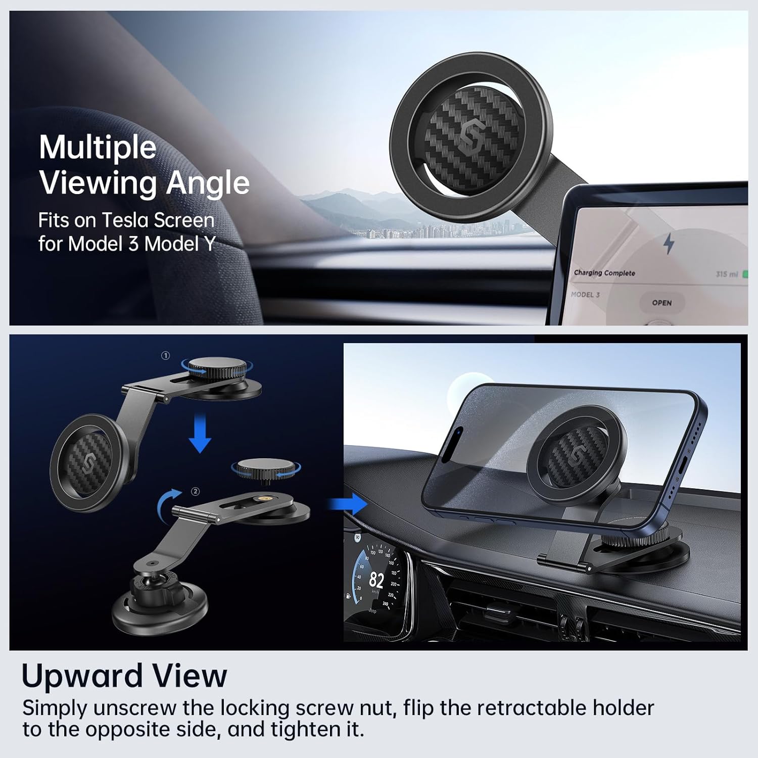 - [360° Rotatable &Foldable Design] - Rotatable ball joint design provides the best driving angle experience. The mount base supports rotation and telescopic adjustment and can be changed into front and back shapes by removing the knob, or you paste it to the Tesla screen rear. The folding design allows you to hide the phone holder. The Magnetic bracket adopts an annular ventilation design, which can guide the cold air from the air outlet, helping to dissipate heat from the phone.