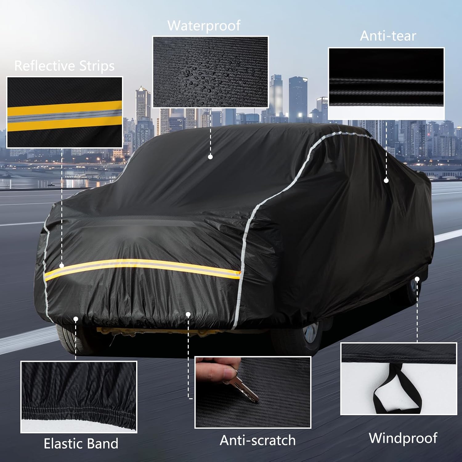 - Thoughtful Design: Our Pickup cover has front and rear elastic hems drawstrings - to ensure fit. The cover with four wind stripes can completely cover and stick to the car body to avoid being easily blown away by the wind. Then the reflective strips provide night visibility, and your car's contour can be easily seen and avoid accidents