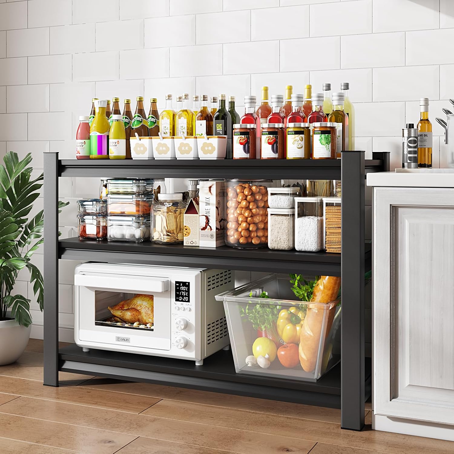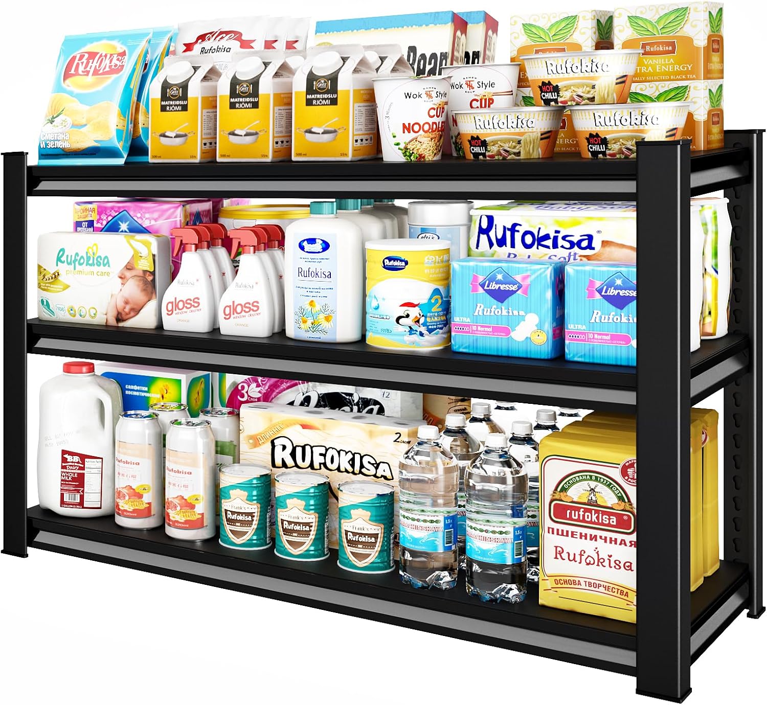 - 【Large Size Storage Shelves】Rufokisa 3-tier metal shelving unit with size of 48"W*18"D*39"H,which provides sufficient storage space and holds tons of items. It will works perfect for your garages, warehouses, basements,kitchens, pantry, basement etc .