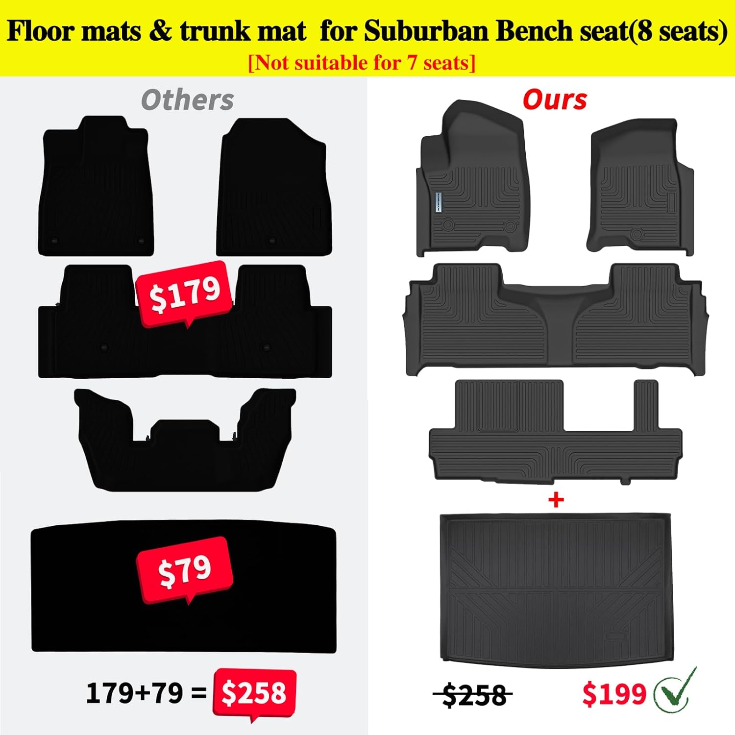 - 【 Perfect for 2021-2025 Chevrolet Suburban with 2nd Row Bench Seats】Only Fit 8 Seats(Not suitable for 7 seats). The SANBAN-AXE floor mats is high-precision laser measured, which means that our customized fit will provide the best coverage range, looking like the mat included with your car. A specially designed fixing system and anti slip tip are used on the cushion to lock it in place.