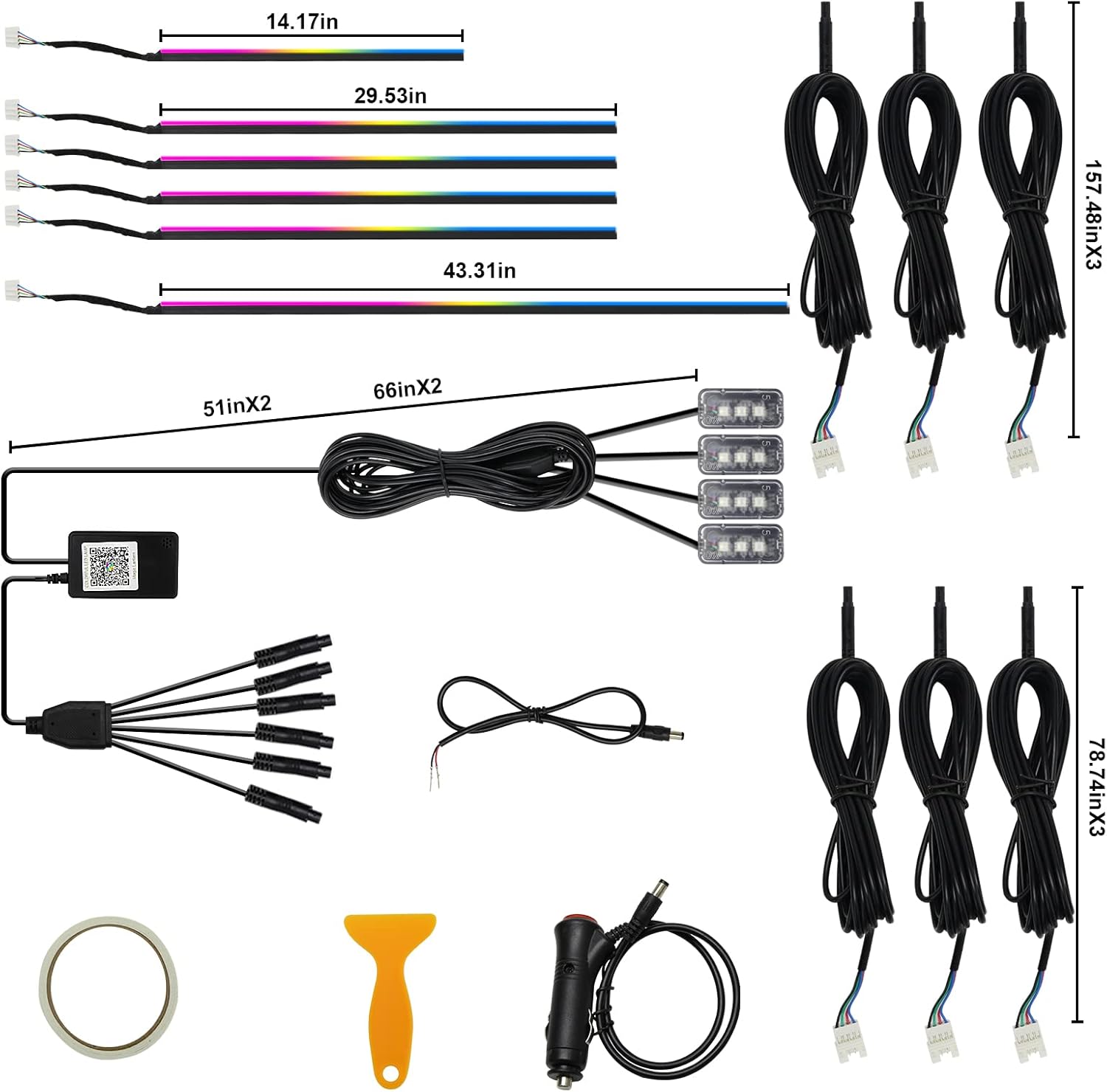 - Included Components : AMKI LED interior car lights (consisting of LED light strip + acrylic optical fiber), 6 acrylic fiber optic light strips, and car interior foot lights AMKI LED interior car lights (consisting of LED light strip + acrylic optical fiber), 6 acrylic fiber optic light strips, and car interior foot lights