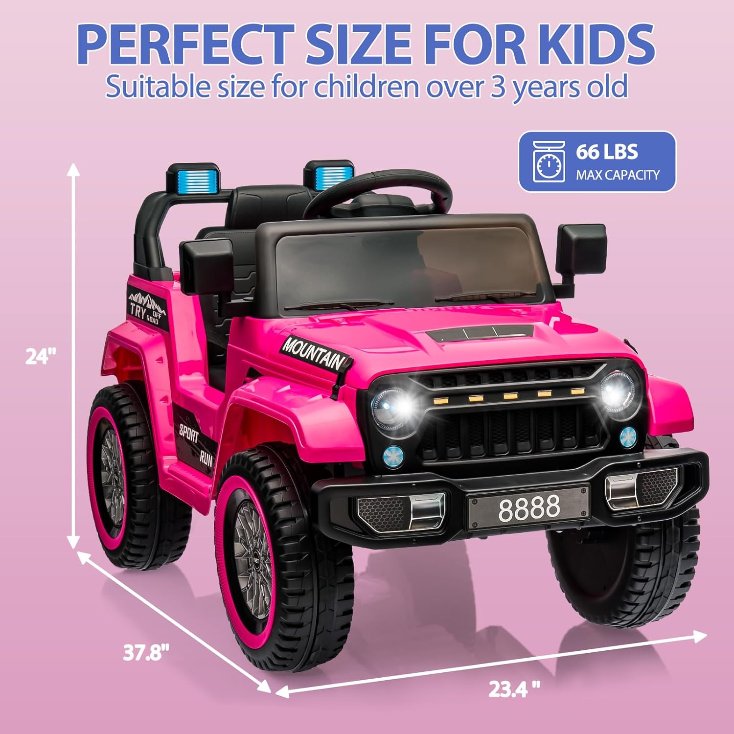 - 【Ideal Ride on Car for Your Kids】Featuring a cool outlook and realistic driving functions, our kids ride on toy is a perfect gift for 3+ years old kids. Solid steel and PP materials make it strong and durable enough to accompany your kids for years. OVERALL DIMENSIONS: 38"(L) x 24"(W) x 24"(H); WEIGHT CAPACITY: 66 lbs.