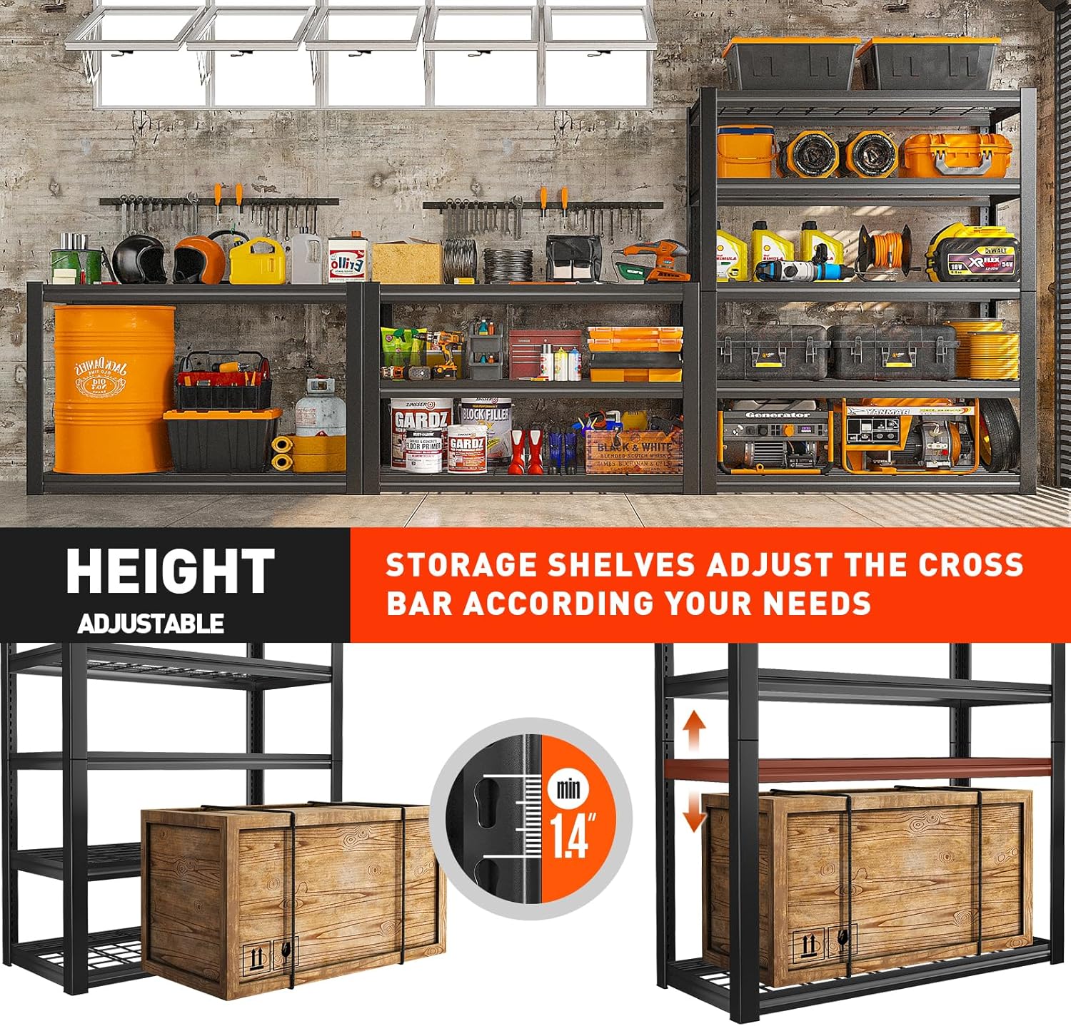 - 【3000LBS Storage Shelves Heavy Duty】REIBII Garage Shelving heavy duty has thickened double metal legs. Each solid thickened metal shelves with 5 layer shelves and 7 double layer support columns can hold up to 600 lbs, with a total bearing capacity of 3000 lbs, which makes garage shelves heavy duty more stable and more stuff can be stored