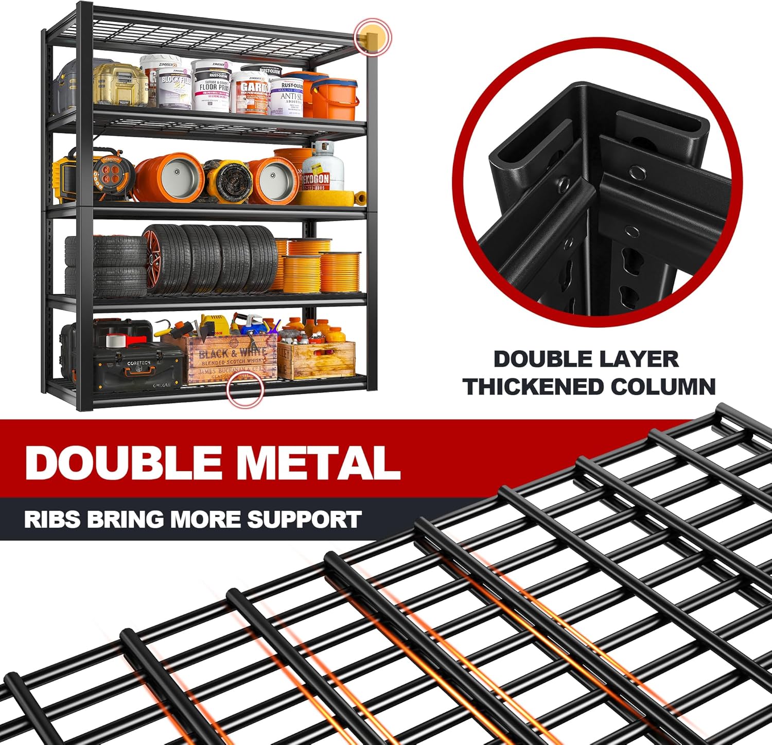 - 【2500LBS Capacity Super Sturdy Metal Garage Storage Shelves】The REIBII Garage Shelving adopts thickened double-layer columns, each metal shelving with additional reinforcing ribs. Each layer can withstand a weight of 500 pounds, with a total bearing capacity of 2500 pounds. Such strong load-bearing capacity and high-quality metal materials make this storage shelves more sturdy and stable than the flimsy MDF storage shelf