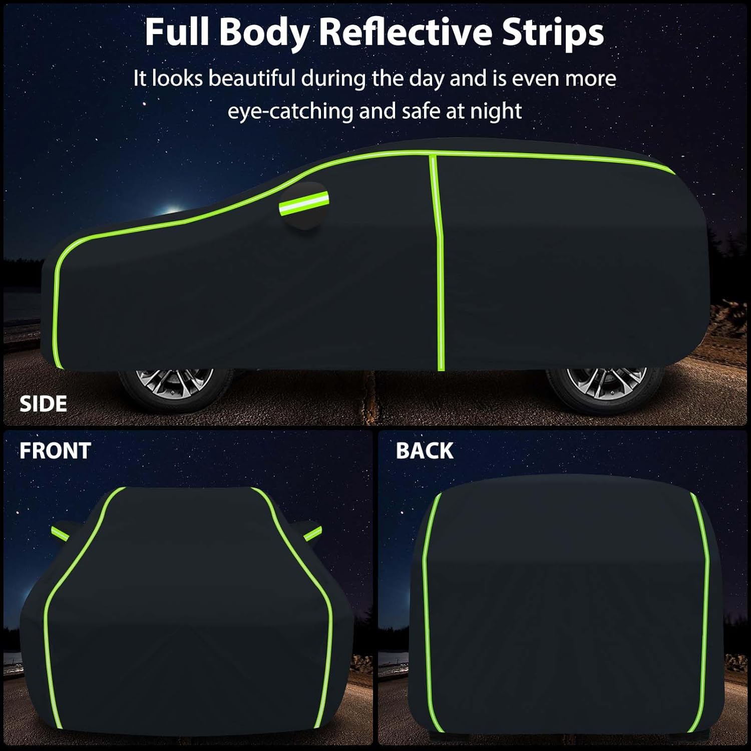 - 【Convenient Double Zipper Design】(1)The car cover has door zippers on both sides, making it convenient for us to retrieve our car contents at any time without the need to remove the cover again. (2)The entire vehicle is equipped with green reflective strips, which can allow pedestrians and vehicles to see the outline of your car in the dark at night, avoiding accidents. (3)There are straps on all four wheels to better secure the car cover and prevent it from being blown away by strong winds. (4)Provide two extra long ropes to better secure the vehicle body, making it less likely to be blown away even in typhoon weather.