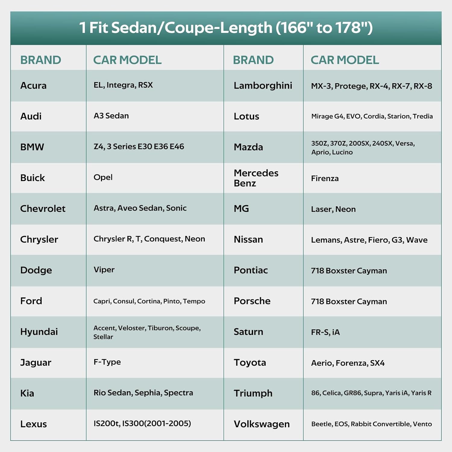 - 【CHOOSE THE RIGHT MODEL】: Molebt full car cover fits Sedan & coupe 166 to 178 inch. For example Audi TT, Toyota 86/Supra, Subaru BRZ, BMW Z4, Nissan Versa/240SX/370Z, Hyundai Accent, Nissan Versa, Porsche 718/Boxster/Cayman, Mazda RX-8 etc.