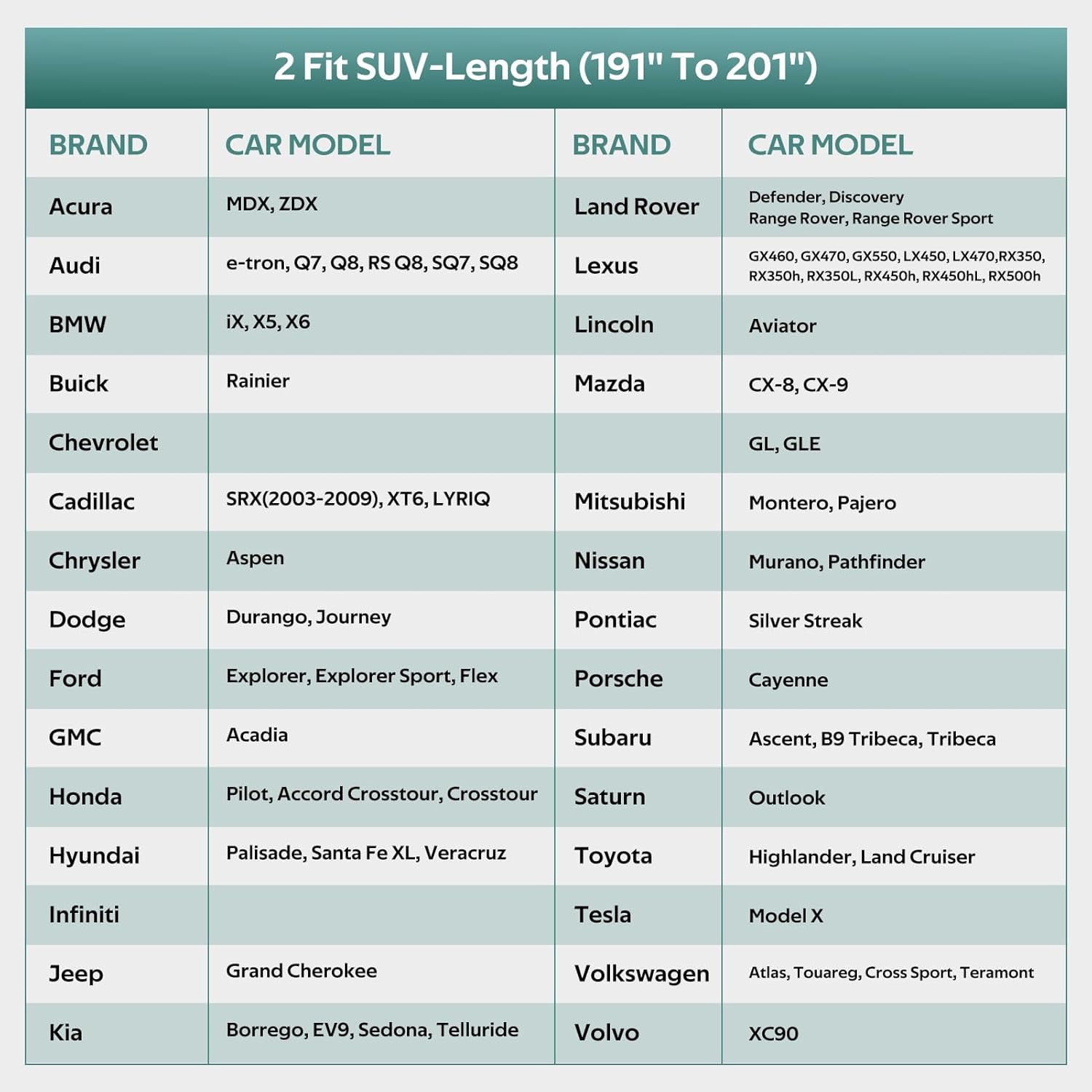 - 【CHOOSE THE RIGHT MODEL】: Molebt car cover fits SUV/Jeep Length: 191"-201".For example Toyota Highlander, Honda Pilot, Nissan Pathfinder, BMW X5, Audi q7, Infiniti QX60/FX35, Acura MDX, Mazda CX-9, Toyota 4Runner, Volvo XC90, Ford Explorer, Porsche Cayenne, Dodge Journey, KIA Telluride, Tesla Model X, etc.