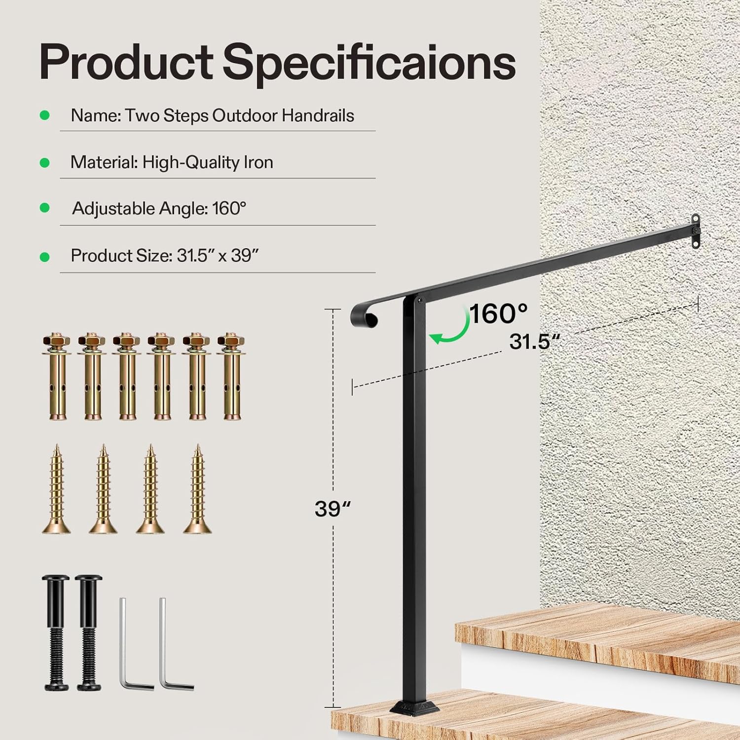 - Adjustable & Flexible: This stair railing offers effortless adjustability to match your preferred step height; Angle adjustment spans from 0 to 160 degrees, accommodating various height requirements; Not only suitable for 1 to 2 vertical steps, but also suitable for use on horizontal surfaces