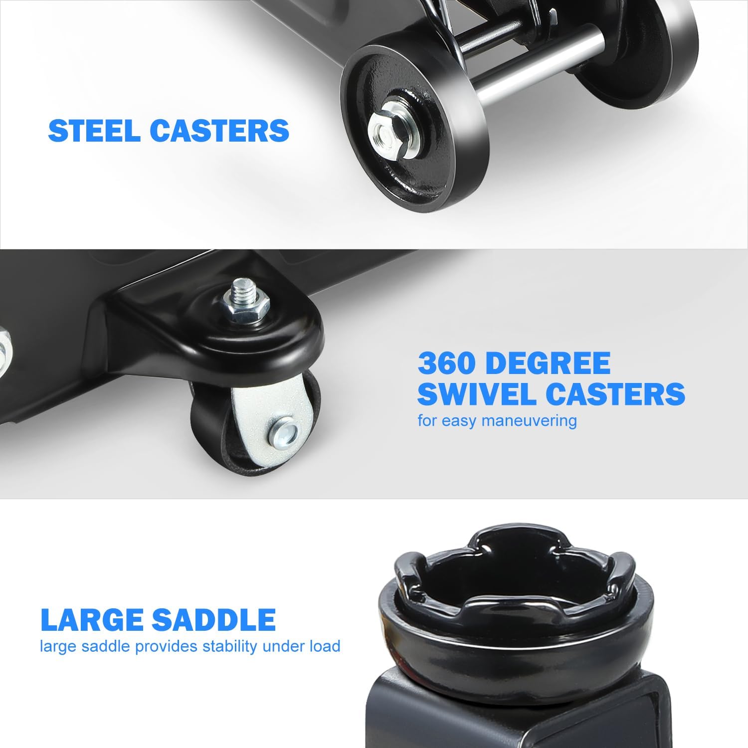- OVERLOAD PROTECTION & EASY JACK POSITIONING - Built-in dependable safety release valve triggers in the event of an overload to prevent damage or injury. The large saddle provides extra stability and helps protect your vehicle.