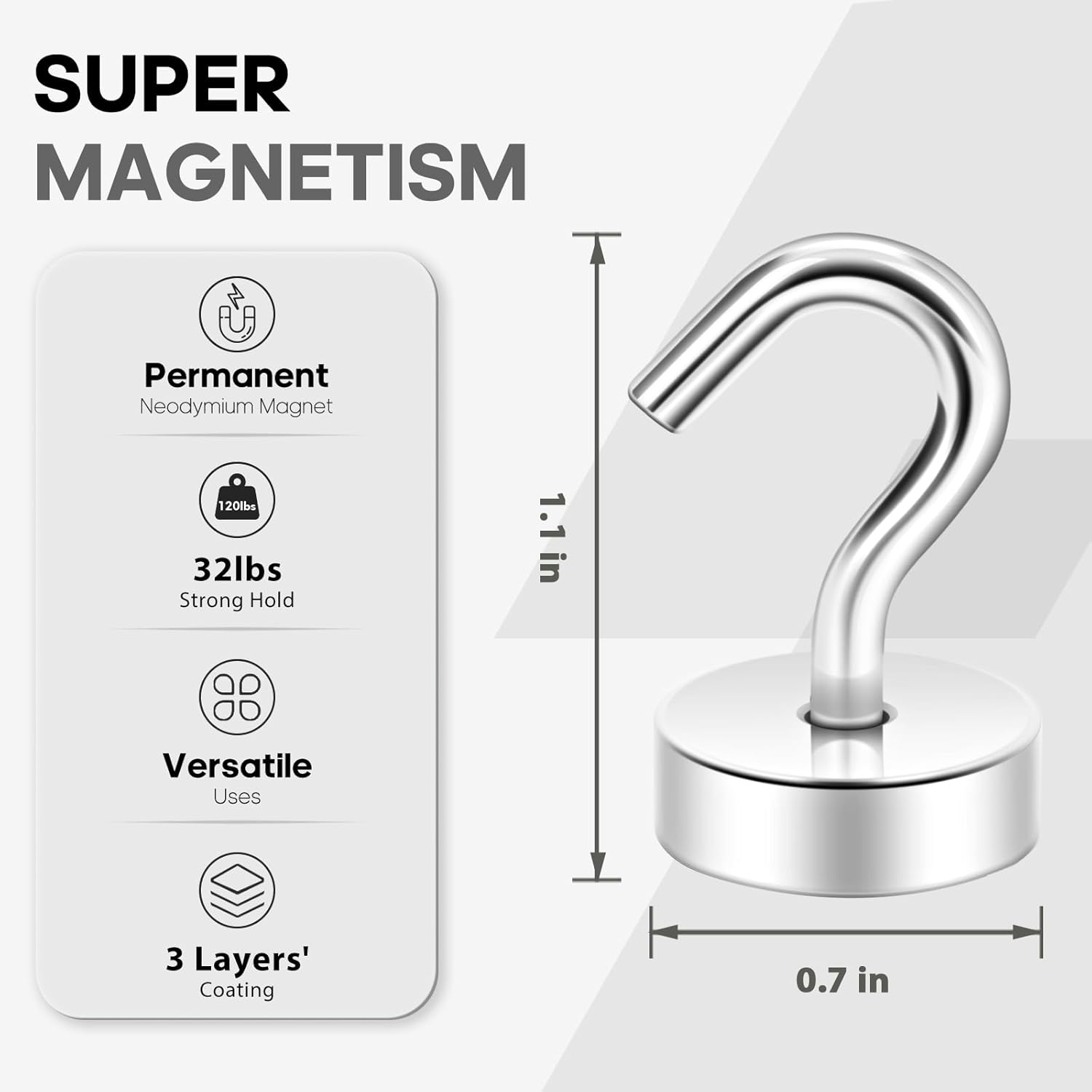 - ✔MAGIC STEEL TUBE DESIGN - Unique design of steel tube inside the base of magnetic hooks greatly increases the attractive force , especially on thin steel! It increase approximately 20% force comparing those none-tube magnets. it solves the problem of weak force on thin steel. Permanent magnetic hook with magic steel tube, strong magnetism lasts forever!