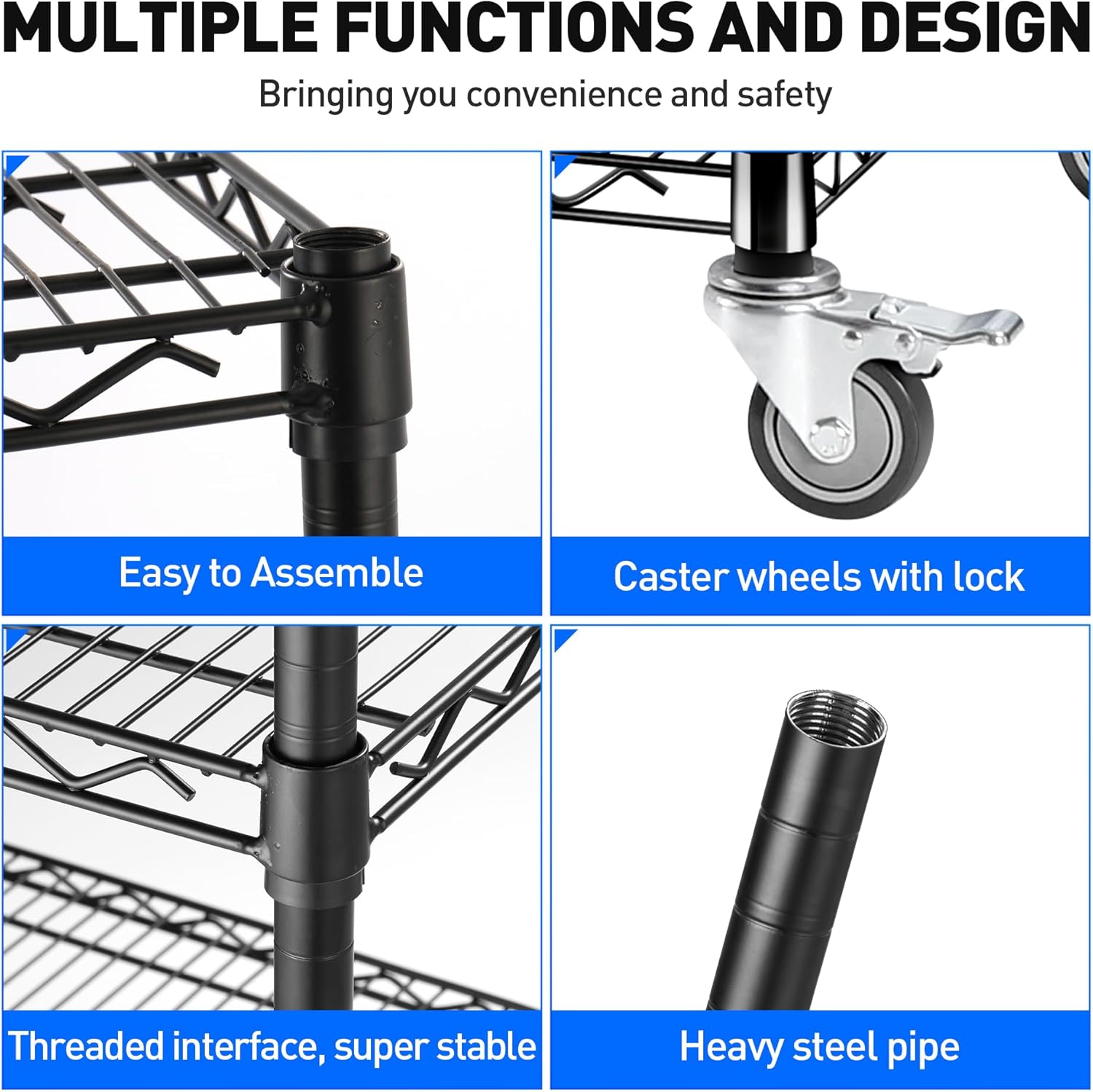 - Perfect Size, Strong Capacity: 60" L x 24" W x 72" H, with high-quality commercial wheels. The 4 wheels can be easily positioned. 2 wheels have a smart lock function for safety. The wire shelf rack has a large capacity and high practicability, and it is the best choice for you to keep the place tidy