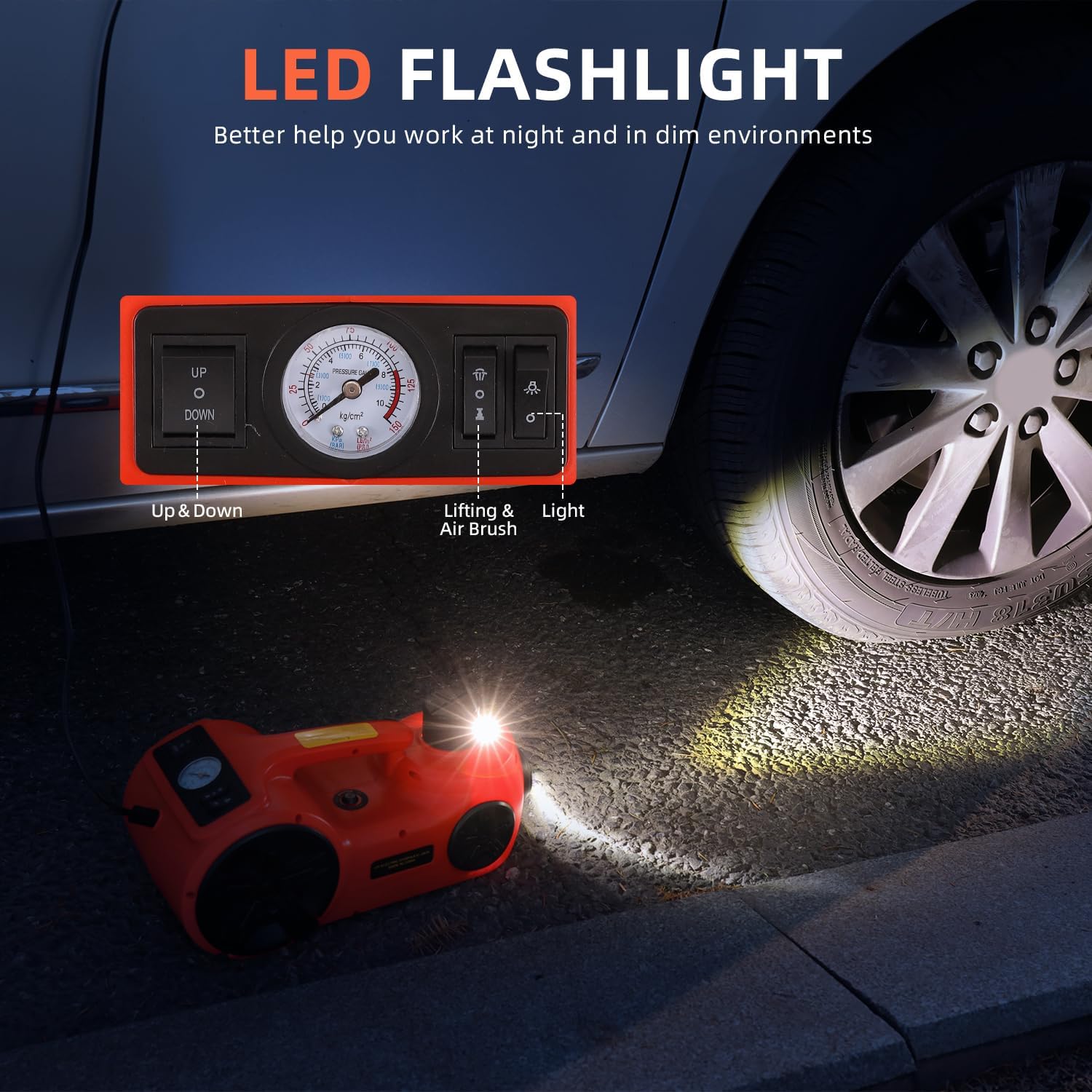 - Versatile Use: This car jack kit integrates lifting, inflation, lighting, and tire removal functions. Its built-in air compressor inflates tires at 35L/min within 2 minutes, while the integrated LED light facilitates tire changes at night