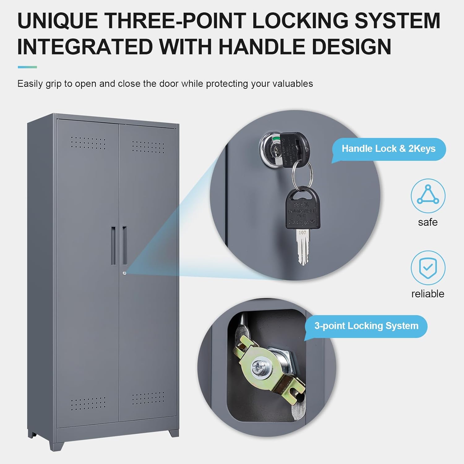 - 【User-Friendly Design】The bottom of thecleaning supplies cabinet with locking doors and adjustable Shelves is made of stainless steel, which is corrosion-resistant and easy to clean. The ventilation holes on the panel prevent moisture and allow breathability, keeping the interior dry and reducing odors. The four standing feet enhance the stability of the cabinet and make it easier to clean underneath.