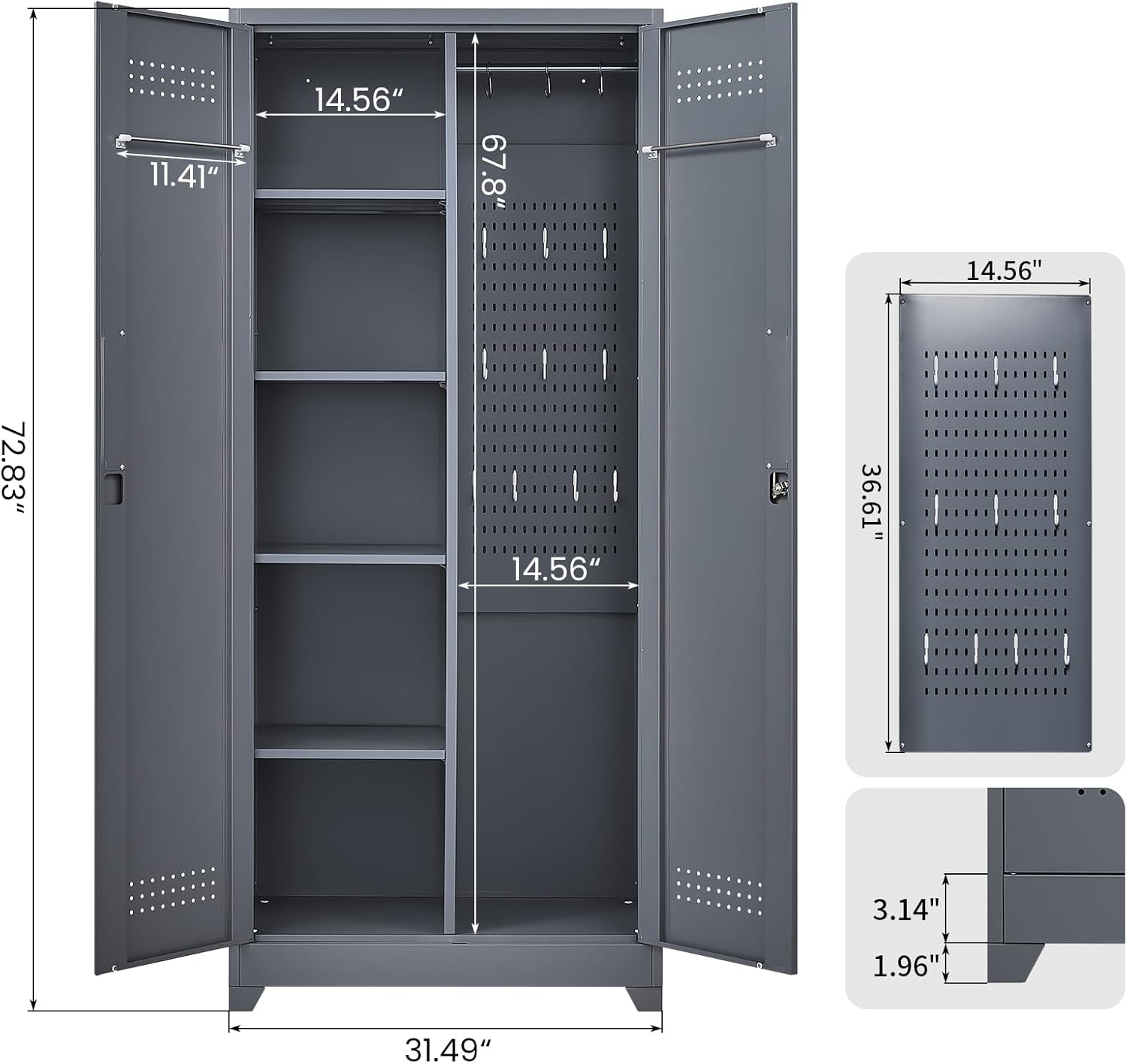 - 【Broom Closet Storage Cabinet】Dimensions: 15.75"D x 31.49"W x 72.8"H. This metal garage storage cabinet is made of pure steel material with a powder-coated surface, which is waterproof and easy to clean, ensuring long-term use. The perforated panel design prevents moisture and allows for breathability.