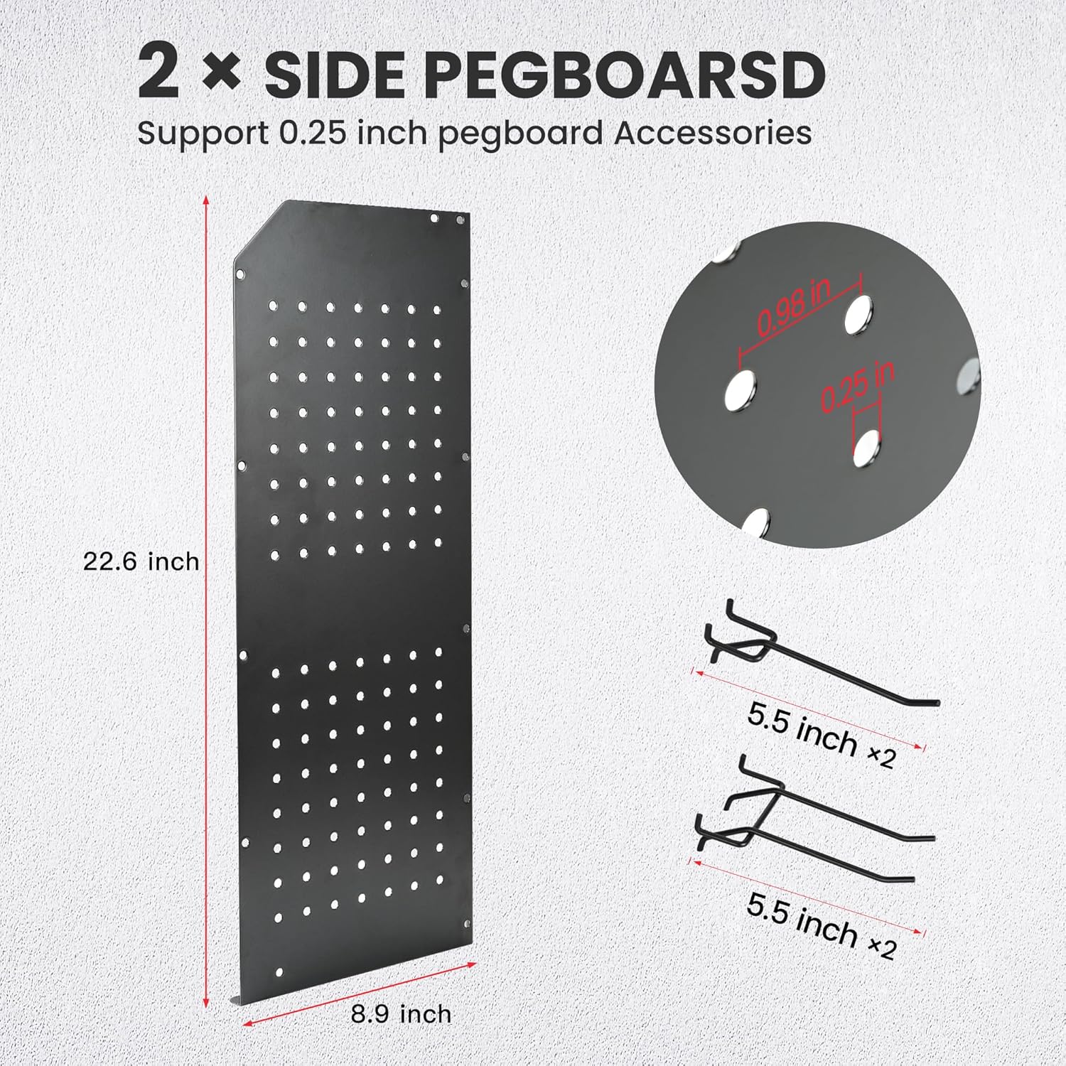 - Versatile Side Pegboards: Hang garage tools on 8.9"W Ă— 12"L side pegboards with included long hooks, drill bit rack, and cordless rack, supports 0.25" pegboard organizer accessories for DIY customization