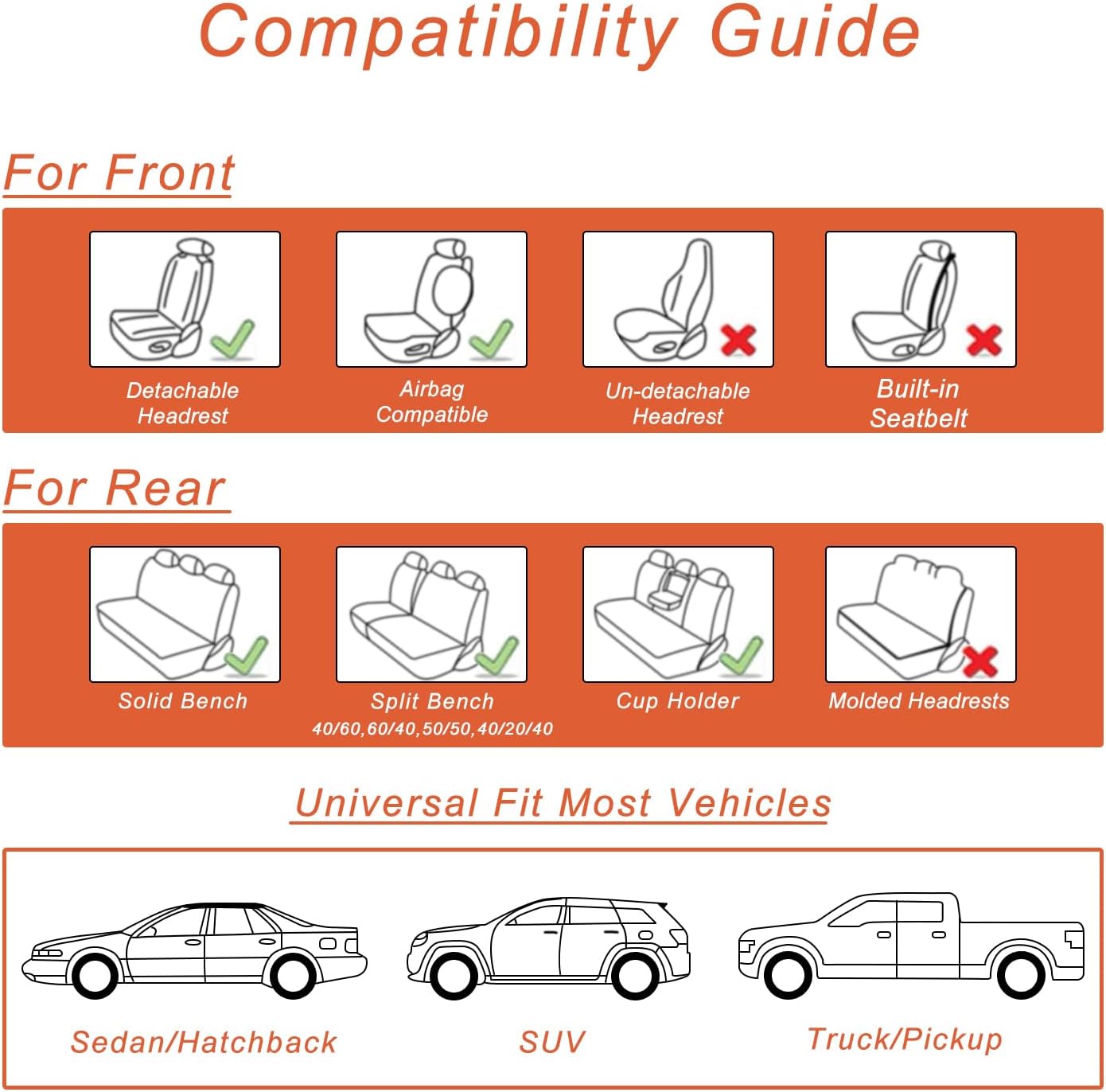 - Universal Fit: Leather Car Seat cover front and back with velcro, can adjust the width according to the size of the seat. The rear seat cover is divided into three sections in the middle with velcro, which can be adjusted according to the length of the seat. The whole set of auto seat cover protectors has a strong wrap around fit most of Sedan Cars Pick-up Trucks SUV.