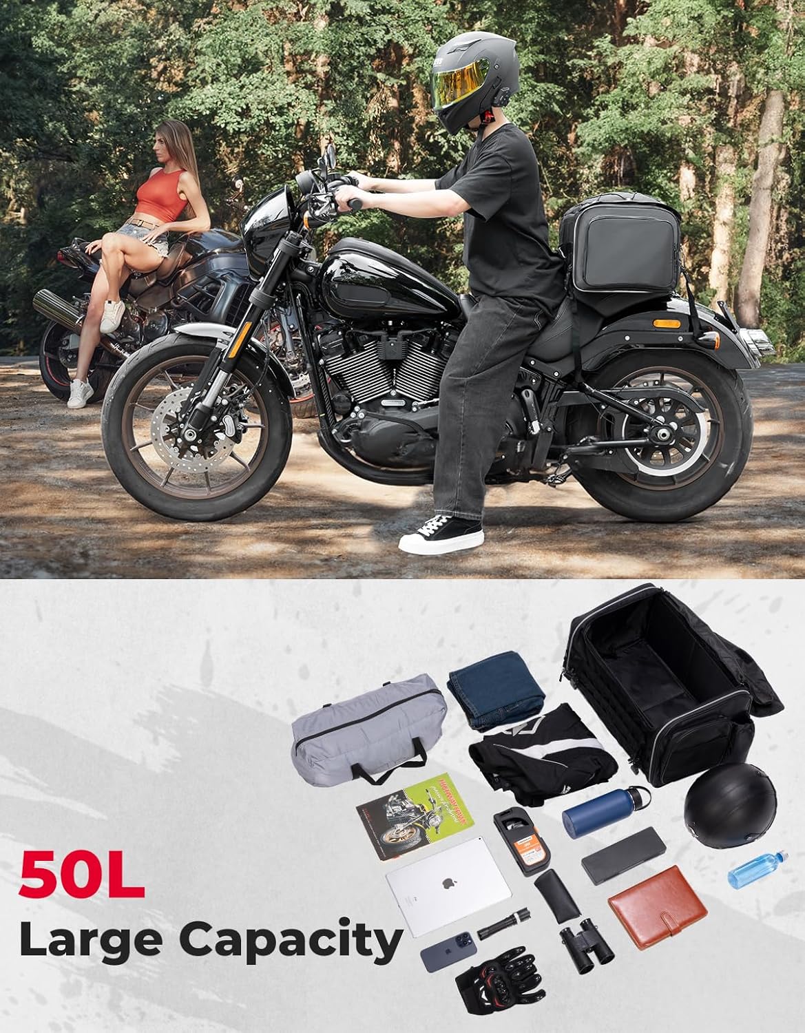 KEMIMOTO Motorcycle Tail Bag, Dual Use Motorcycle Rear Seat Bag with Waterproof Rain Cover, 50L Expandable Motorbike Helmet Bag Luggage Storage Backpack