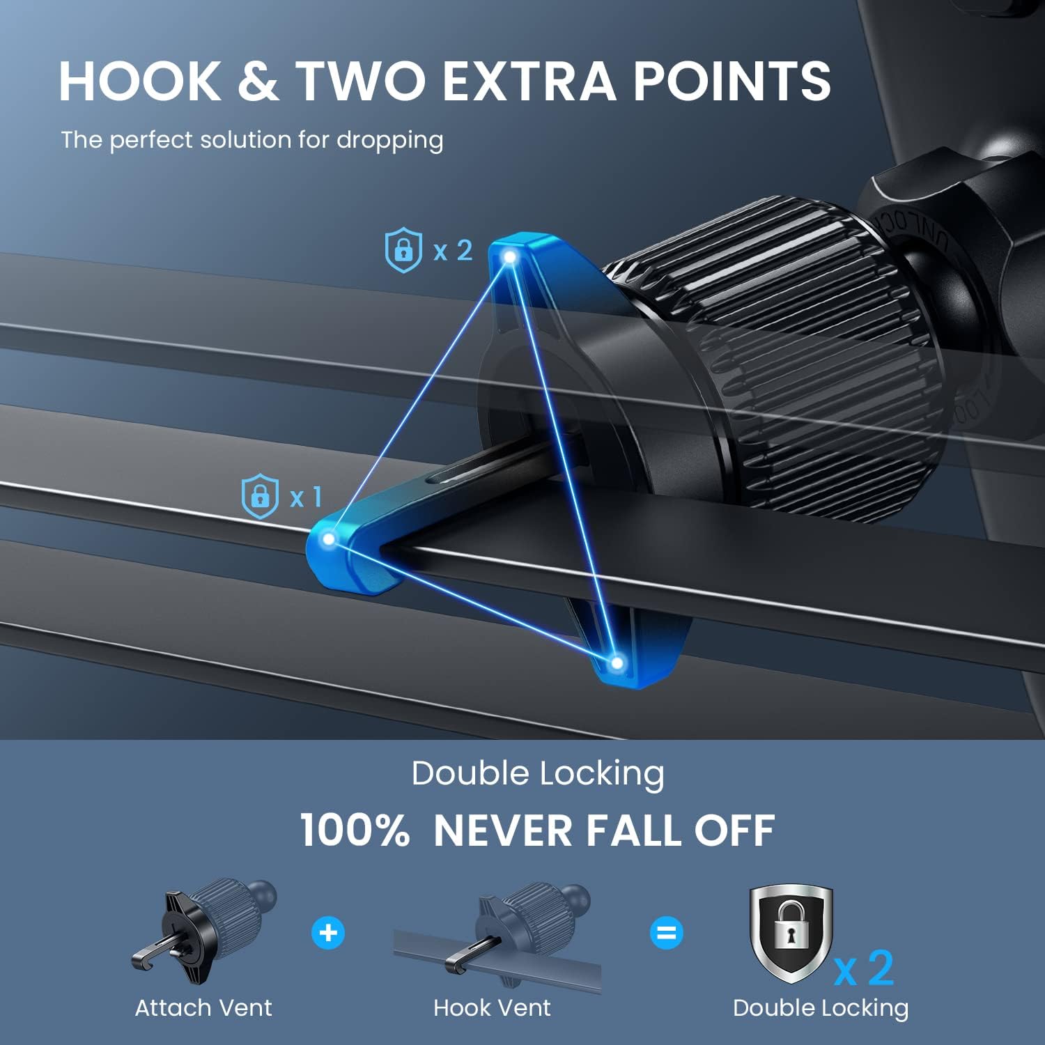 - 【Never Fall Off-Metal Hook Design】Car phone holder mount features an upgraded metal hook with a thick plastic layer wrapped around outside which firmly locking the vent blades without scratches. Phone mount for car is compatible with both horizontal and vertical vents, ensures stable even on sharp turns or bumpy roads.