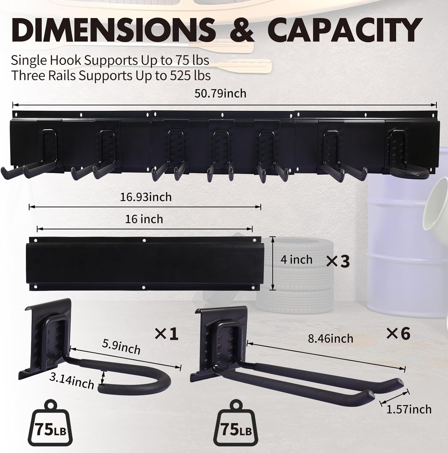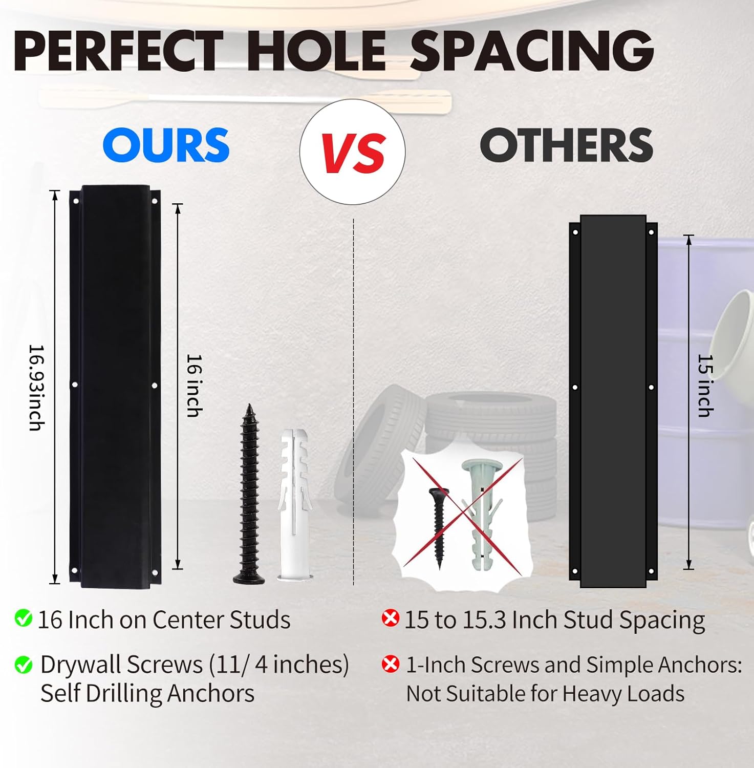 - SAY GOODBYE TO TIGHT INSTALLATION! We've updated the spacing between holes on both sides to 16 inches with our tool hook, ensuring effortless setup and a smooth, stress-free experience with our wall storage rack