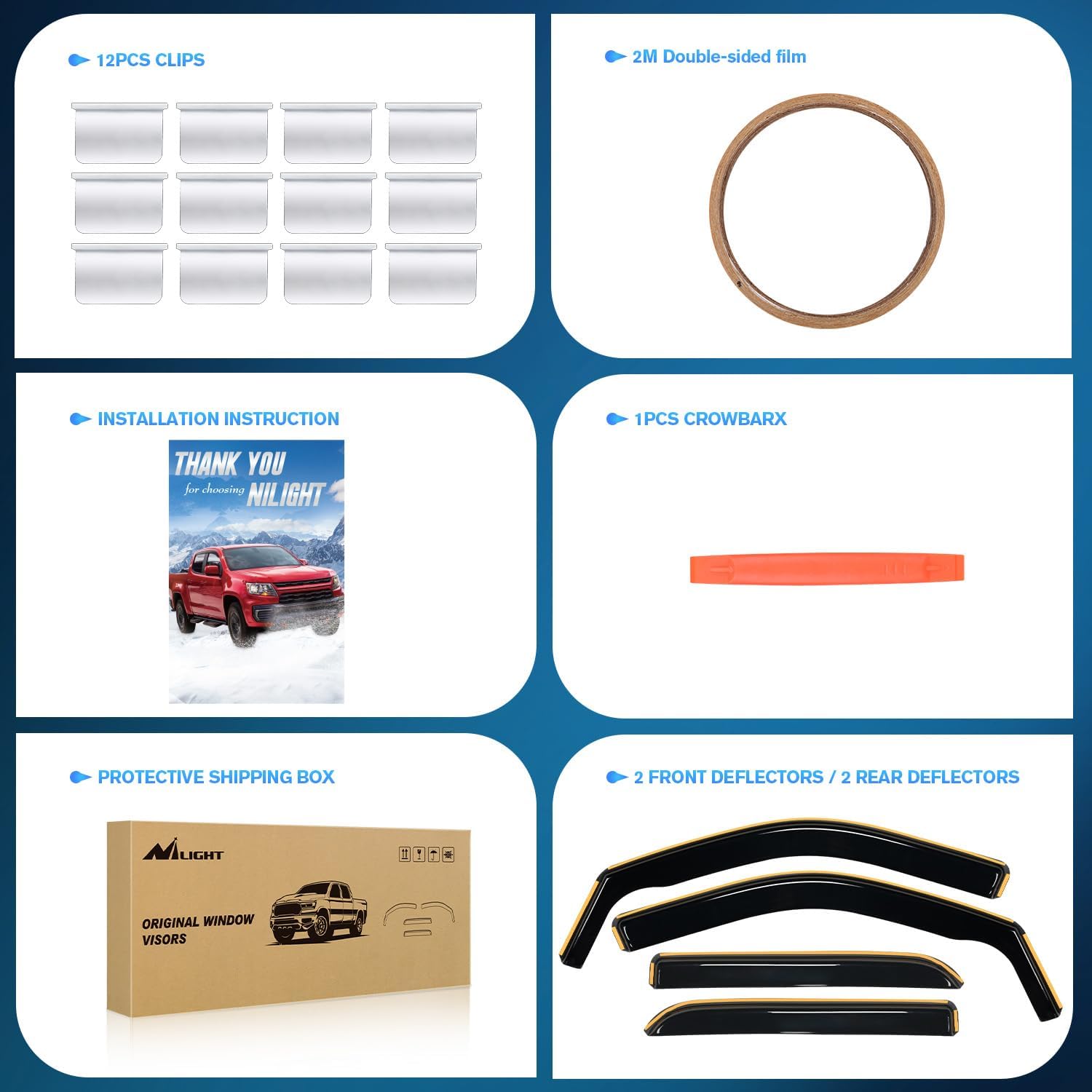 - QUICK AND EASY INSTALL: Nilight Wind Deflectors provides perfect fit for your Car. Just slip it onto your car’s window and your job is done within minutes. There is no drilling or no tools required. Be sure that window deflectors are water resistant, sun protective and will not bend, break or crack regardless of the weather conditions