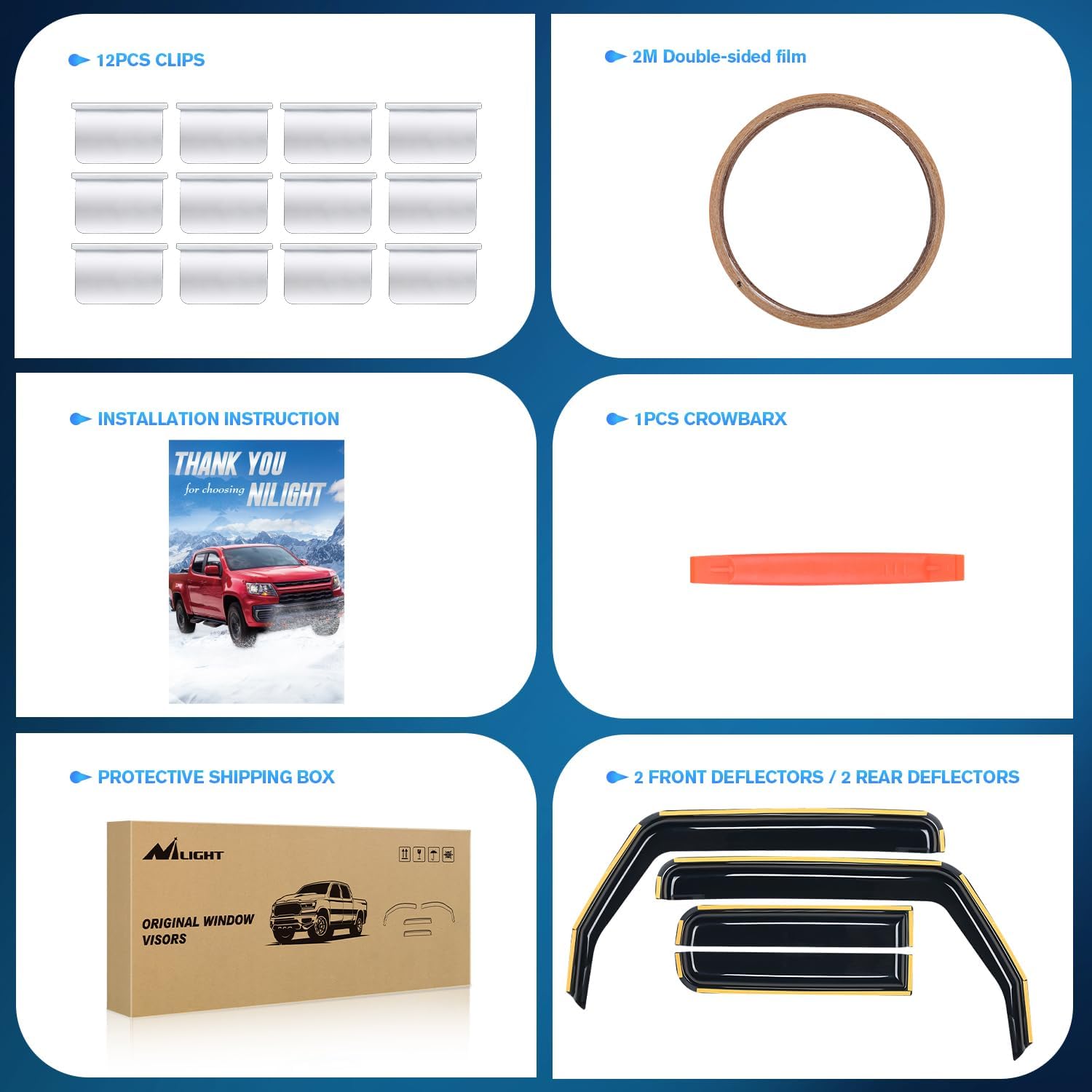 - QUICK AND EASY INSTALL: Nilight Wind Deflectors provides perfect fit for your Car. Just slip it onto your car’s window and your job is done within minutes. There is no drilling or no tools required.