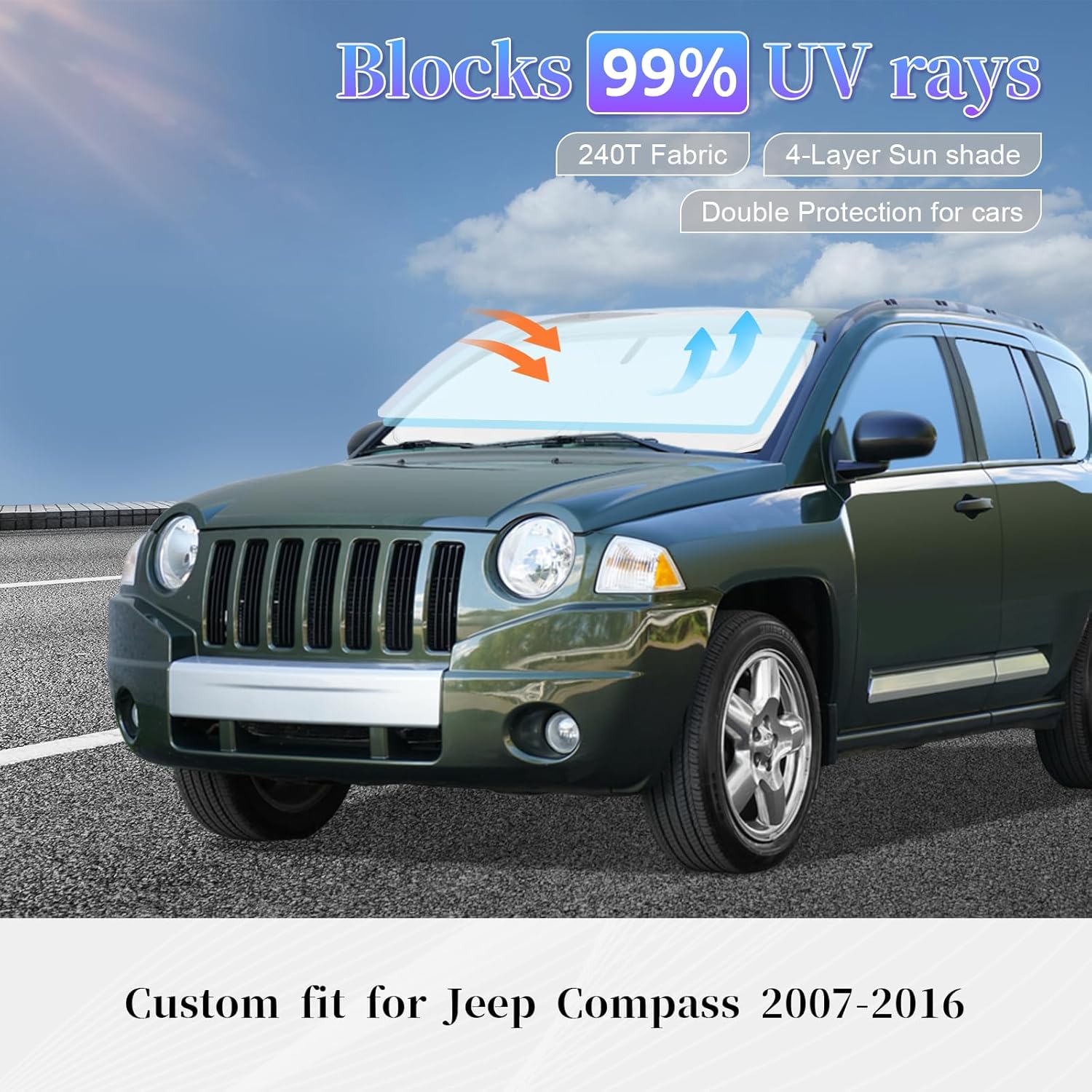 Sun Shade Sunshade for Jeep Compass Windshield Cover, 4-Layer Front Window Shade Custom fit Compass 2007-2016 Sun Visor 240T Retractable Shade Shield Blocks UV Rays Cooler Car Accessories
