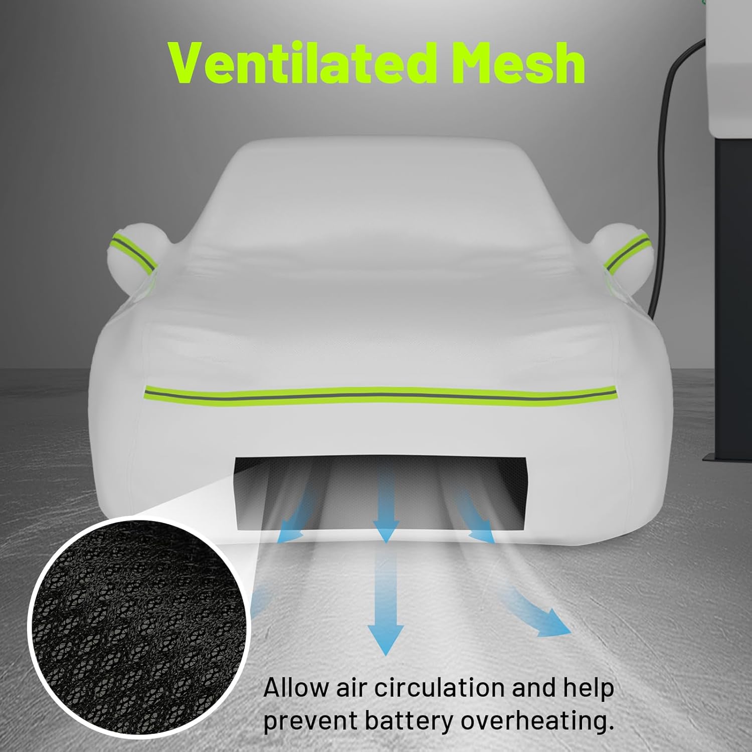 - 【Customized Design for Tesla Model 3】- Featuring a charging port opening and ventilated mesh design. ① A built-in zippered opening for the charging port allows your tesla to charge without removing the full car cover. ② The ventilated mesh guarantees effective air circulation and battery conditioning, safeguarding the Tesla battery in hot conditions and maintaining optimal battery performance during charging.