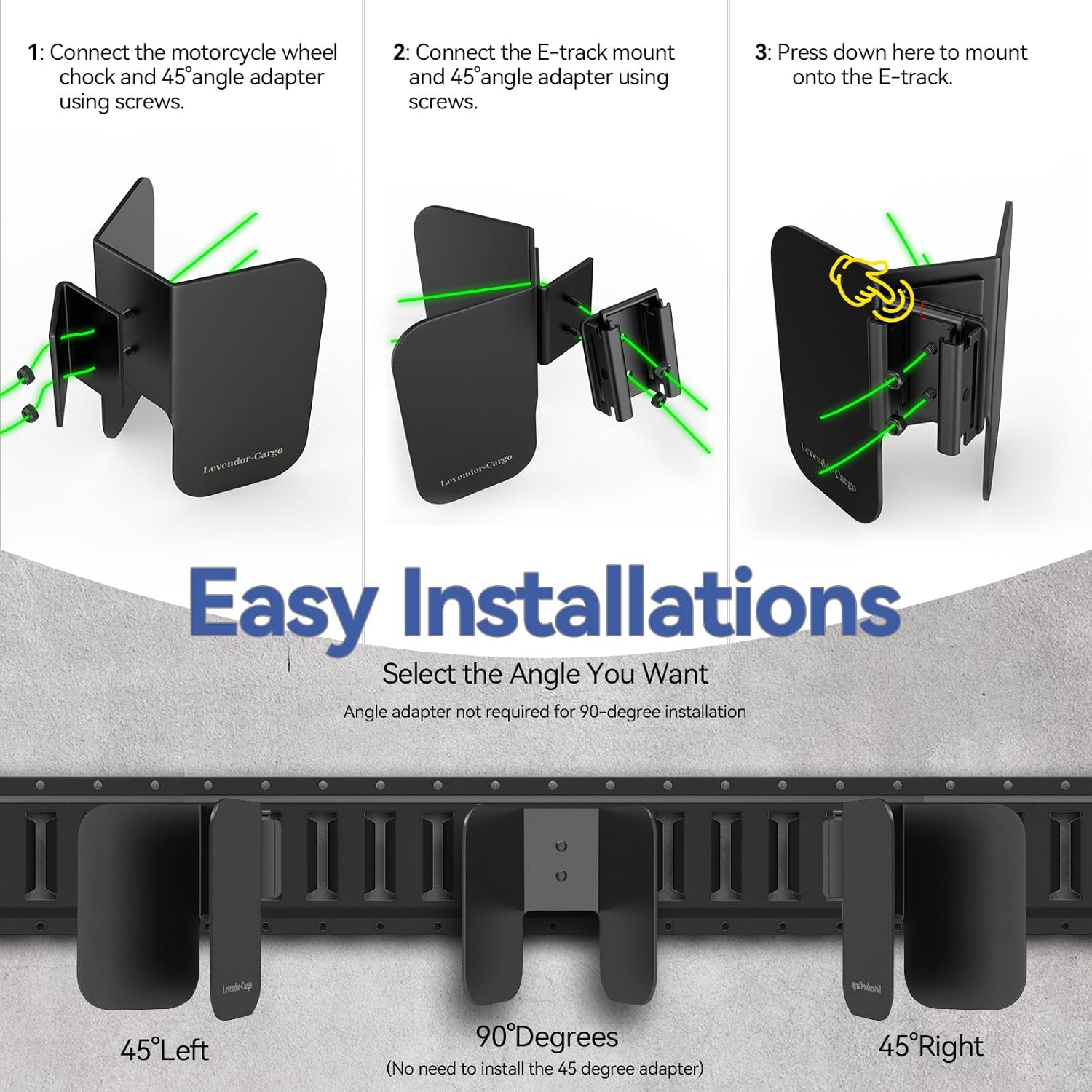 - Multi-Angle Mounting : The Motorcycle E-Track wheel chock stabilizes your motorcycle at 90 degrees, 45 degrees left and 45 degrees right. Installing the E track motorcycle tire chock in your garage/truck/trailer is a great solution to motorcycle storage problems