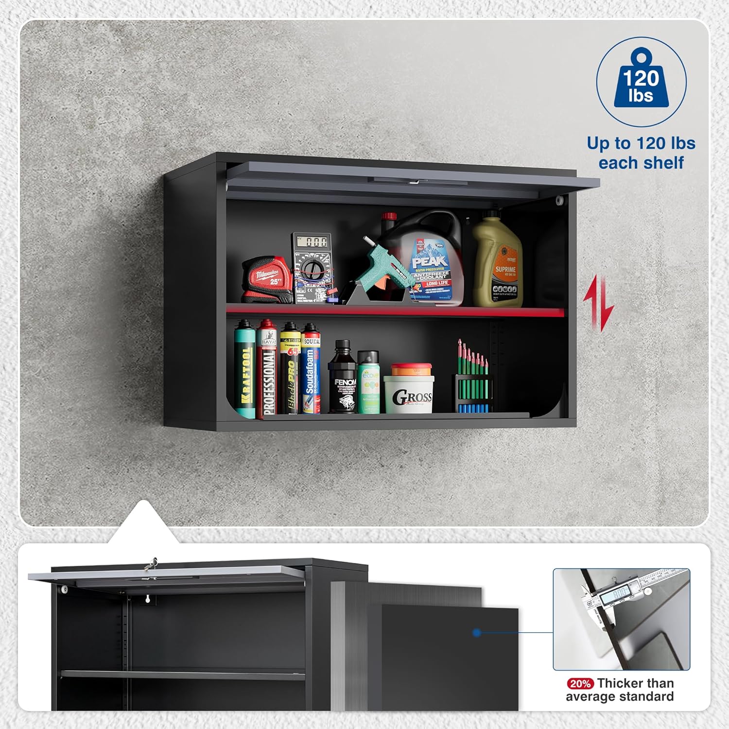 - High-quality - Our metal wall cabinet is crafted from 0.6mm thick SPCC steel plate, which compared to inexpensive wooden and plastic wall cabinets, can withstand significantly more weight. Each shelf can bear up to 120 pounds. It is the optimal choice for maximizing your storage space.