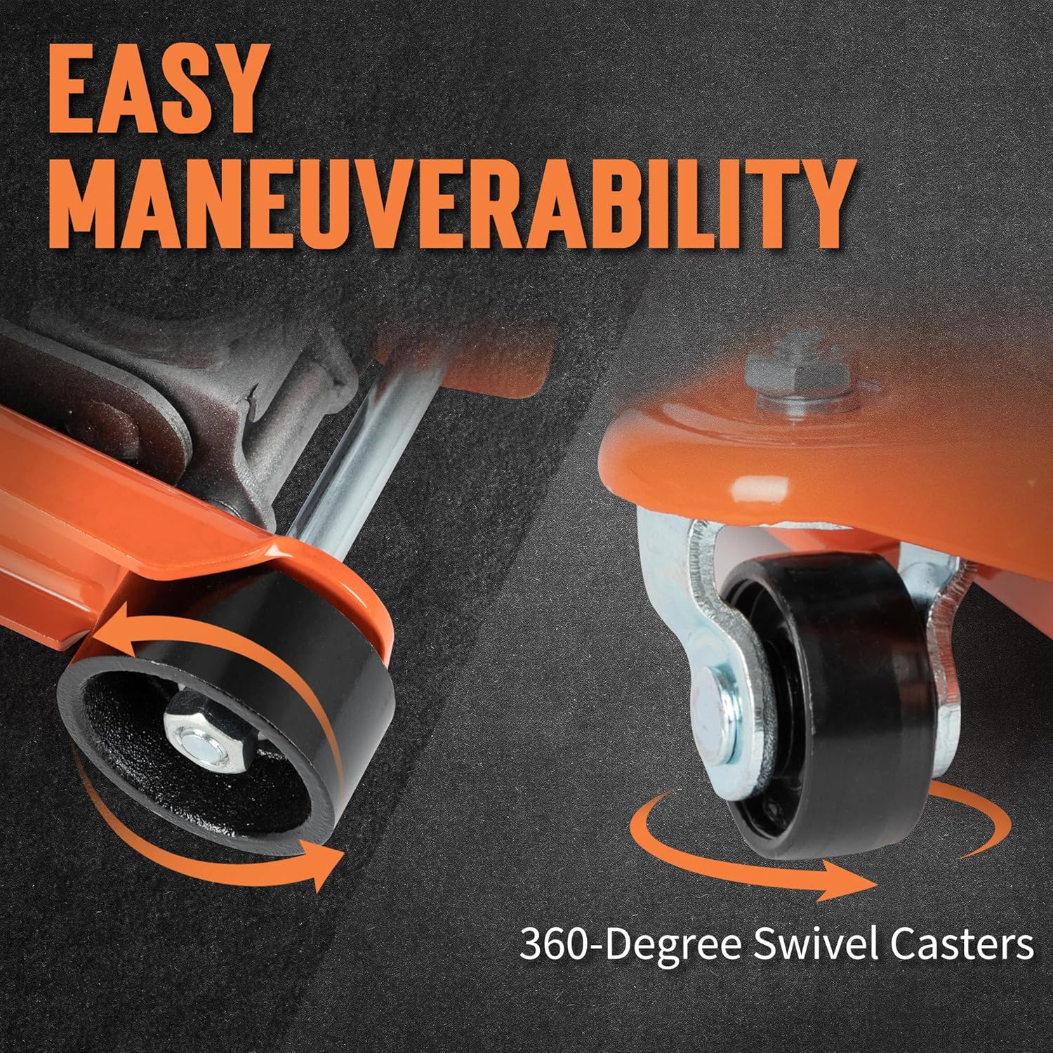 - Effortless Mobility: Outfitted with 2 large steel casters and 2 360-degree swivel casters, low profile car jack is easy to move around. The carrier handles and detachable long handle ensure easy transport to wherever you need it