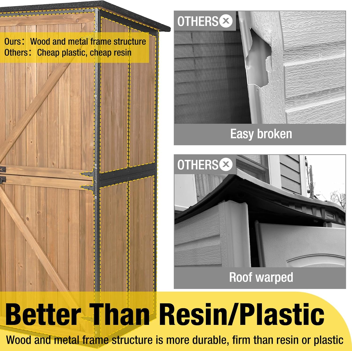- Water Resistant Design: This garden storage tool shed has a sloped roof prevents water accumulation. Raised wooden floor prevents water ingress, ensuring a dry and secure storage space