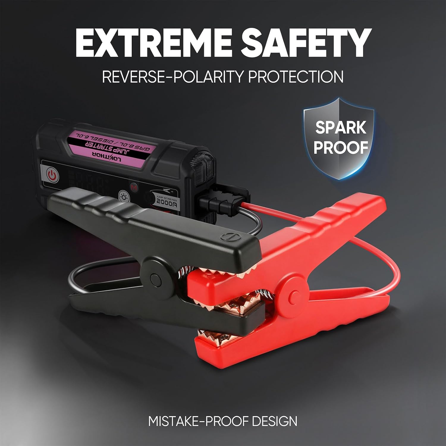 - Extreme Safe - Designed with an integrated battery management system and smart self-identifying clip, the LOKITHOR emergency starter is safe and fully insulated. 10 protection types, including Spark-Proof Protection, Reverse-Charge Protection, Over-Charge Protection, Over-Current Protection, Short-Circuit Protection, Reverse-Polarity Protection, Low-Temp Protection, High-Temp Protection, Over-Voltage Protection , Over-Load Protection, securely connects to any 12-volt vehicle.