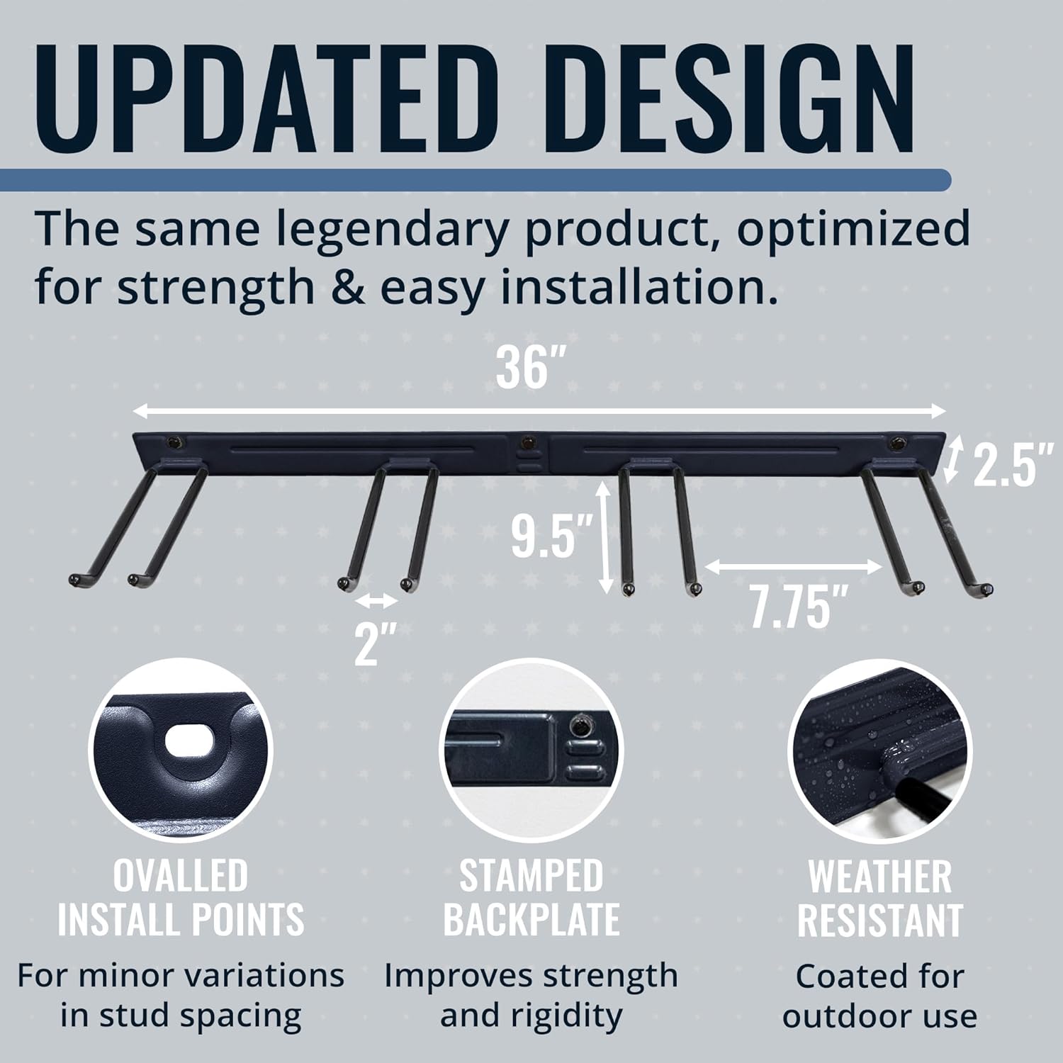 - RECLAIM YOUR GARAGE – Conquer clutter with this garden tool organizer designed for garage storage, sheds, or workshops. Measuring 36" L x 9.5" W x 2.5" H, it features four PVC-coated garage hooks and a 250 lb weight capacity, ideal for storing shovels, brooms, rakes, and power tools. Installs with 3 heavy-duty lag screws directly into 16" wall studs for secure, long-lasting support.
