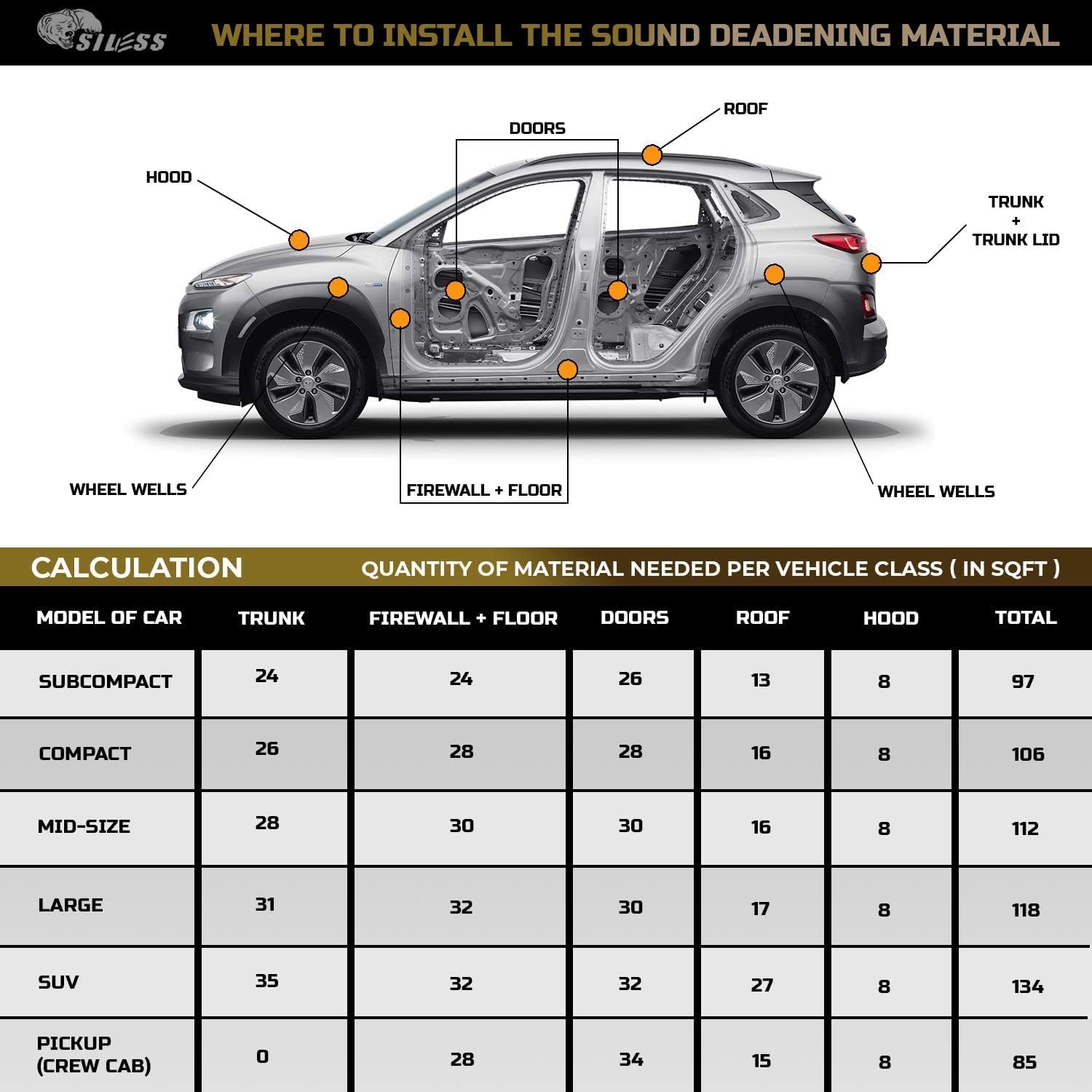 - ★ Ease of Installation — SILESS VIBRO Damping Material is easy to install with a “peel and place” application. Simply trim the pieces to fit, peel and place and hand roll to ensure good adhesion. No messy spray-on paints or adhesives are needed to install this product.