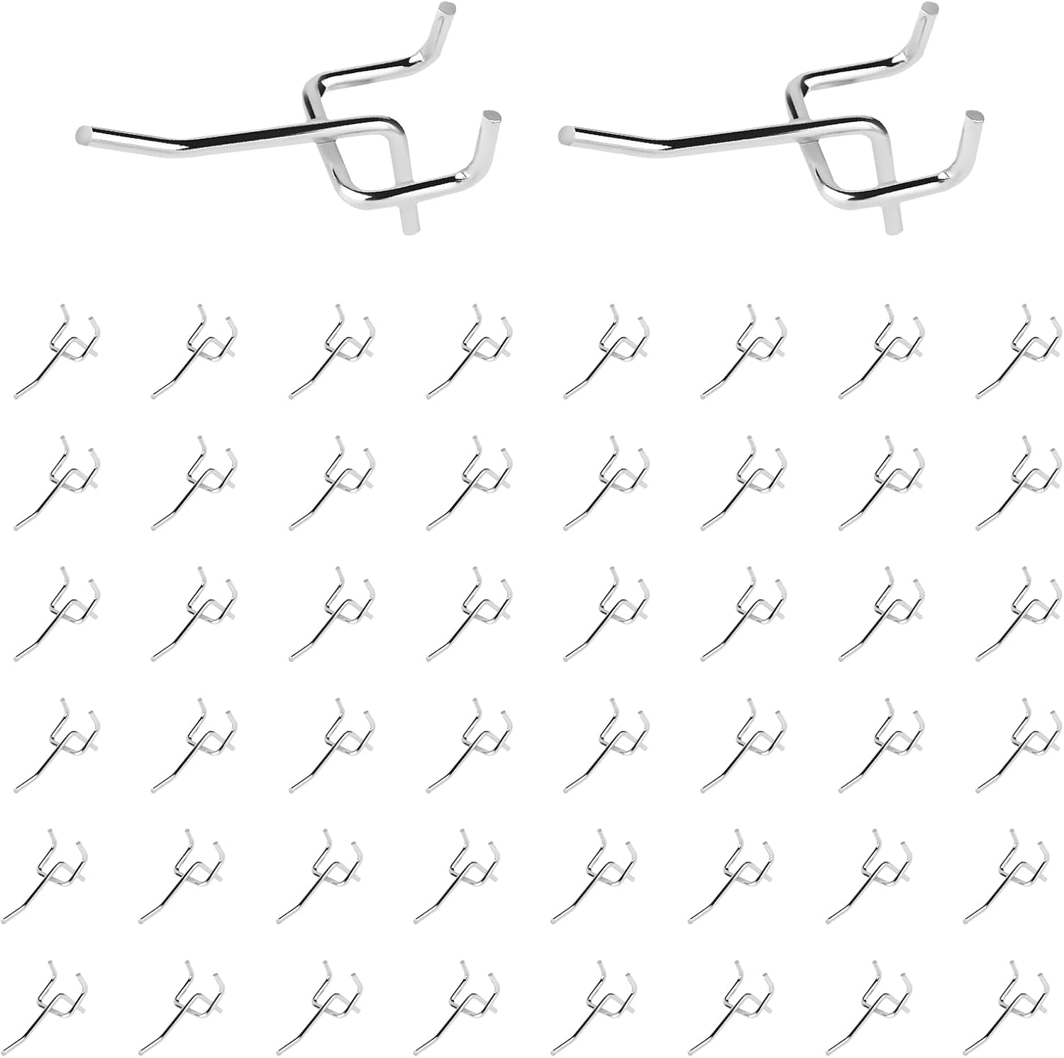 - [50Pcs Peg Board Shelving Hook] You will receive 40pcs 2" /50mm silver peg board display hooks. Their thickness is approx. 4 mm/ 0.16 inch. The enough quantity will meet your space planning or replacement needs. Ideal Peg Board Organizer Accessories for Garage Tool Organization.