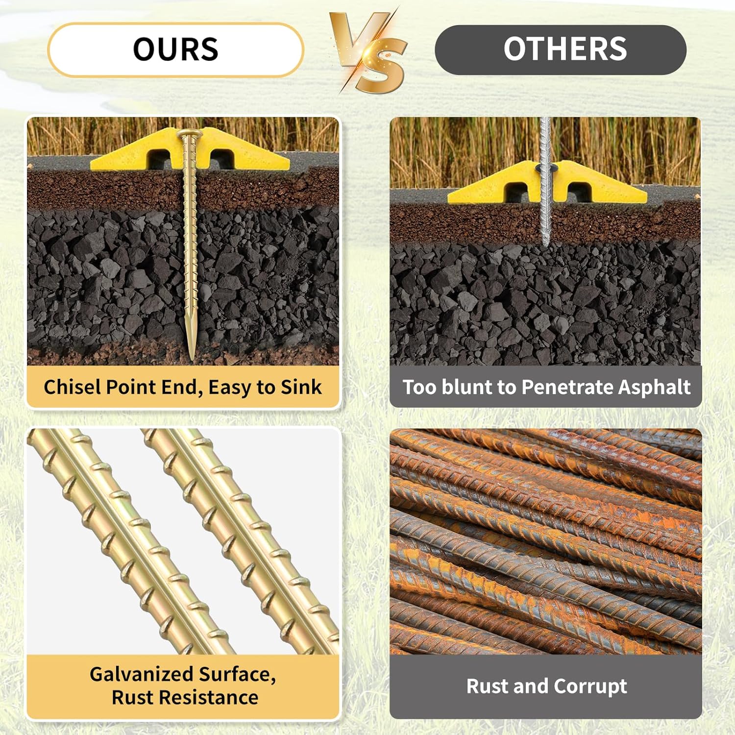 - 【Ribbed & Yellow Galvanized】These rebar stakes are made of malleable steel material. Yellow galvanized to help avoid rust. Ribbed ground anchors are solid, secure firmly and no bend.