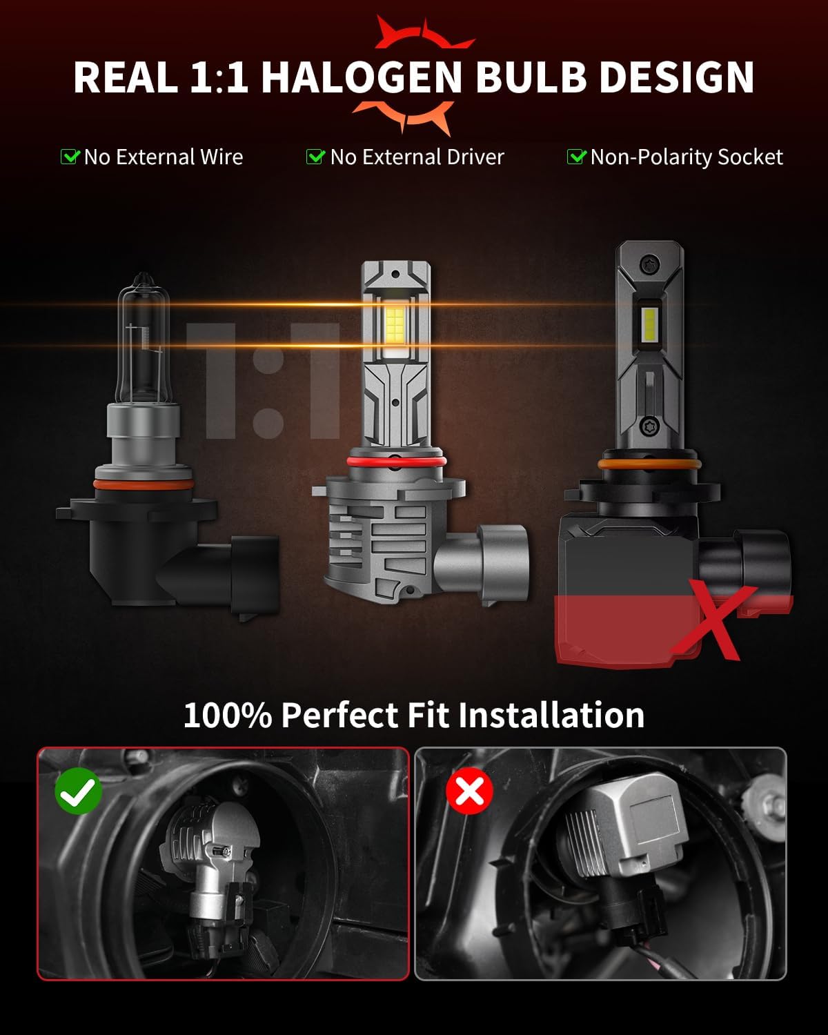 - [True 1:1 Halogen Design] Interface and dimensions are the same as halogen. No oversized bases or external drivers. Non-polarized plug-in design. 5-minute quick installation.