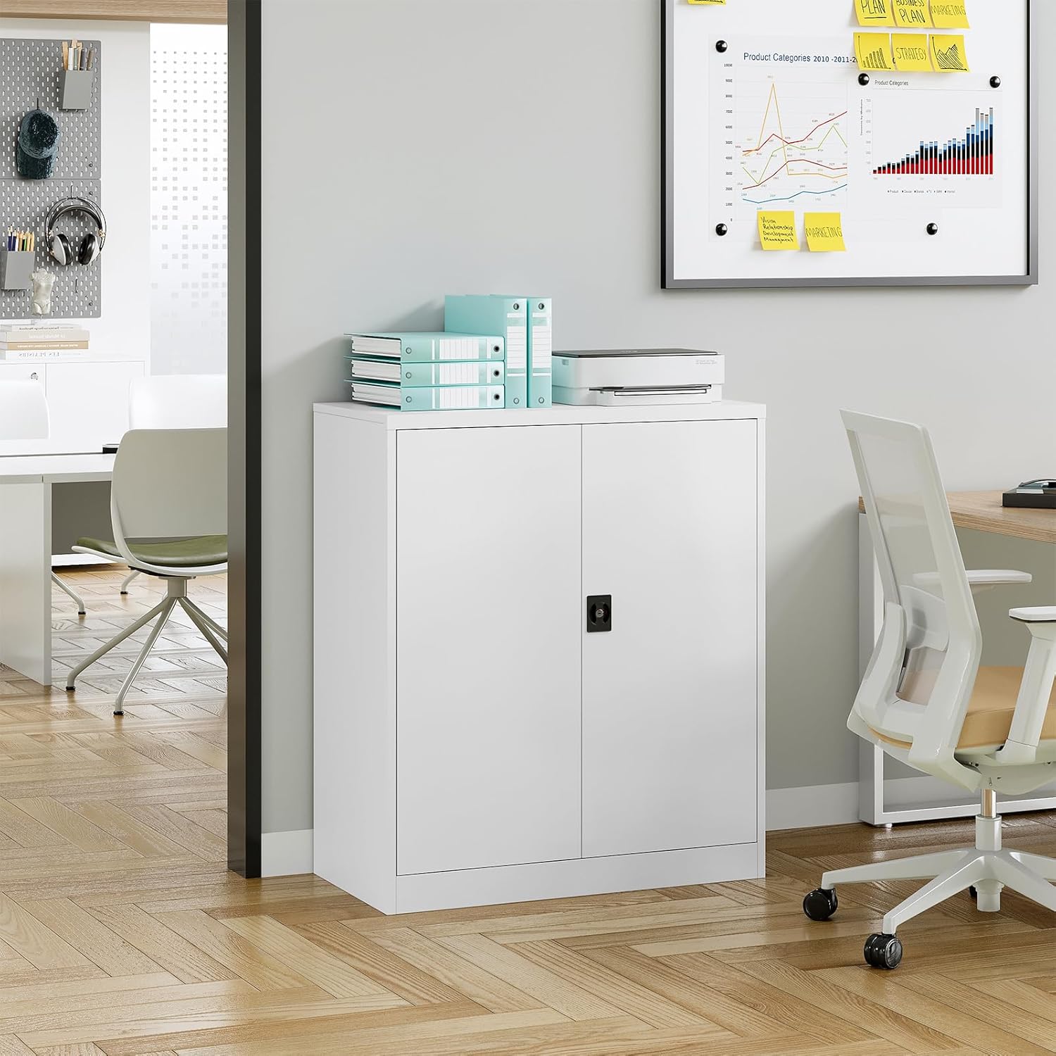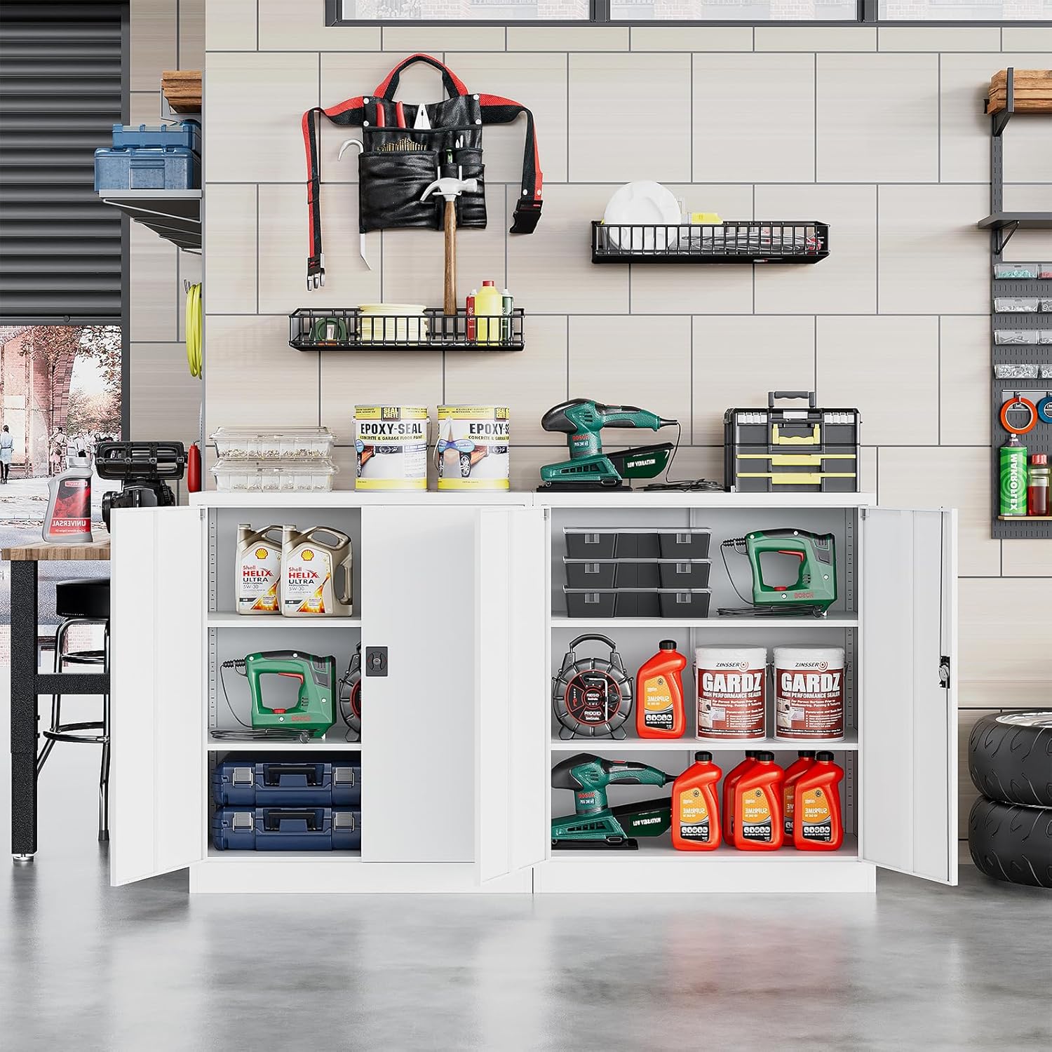 - 【Multi-Uses】This metal storage cabinet with doors and shelves can be used in the home, office, garage, workshop, school, or anywhere you need additional storage.