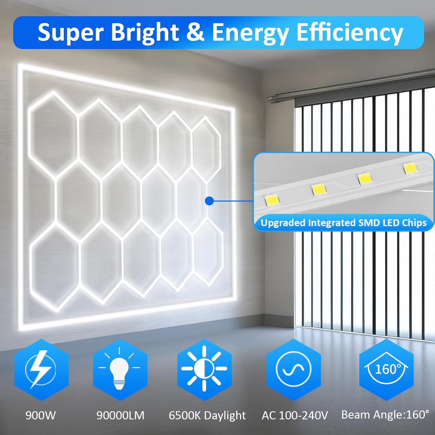 tewei Hexagon LED Garage Lights with Rectangle Frame, 900W 90000LM 6500K, Ultra-Bright Hexagon LED Shop Lights for Garage, 14 Grids Hex Ceiling Light for Workshop, Warehouse, Gym, Car Detailing Shop