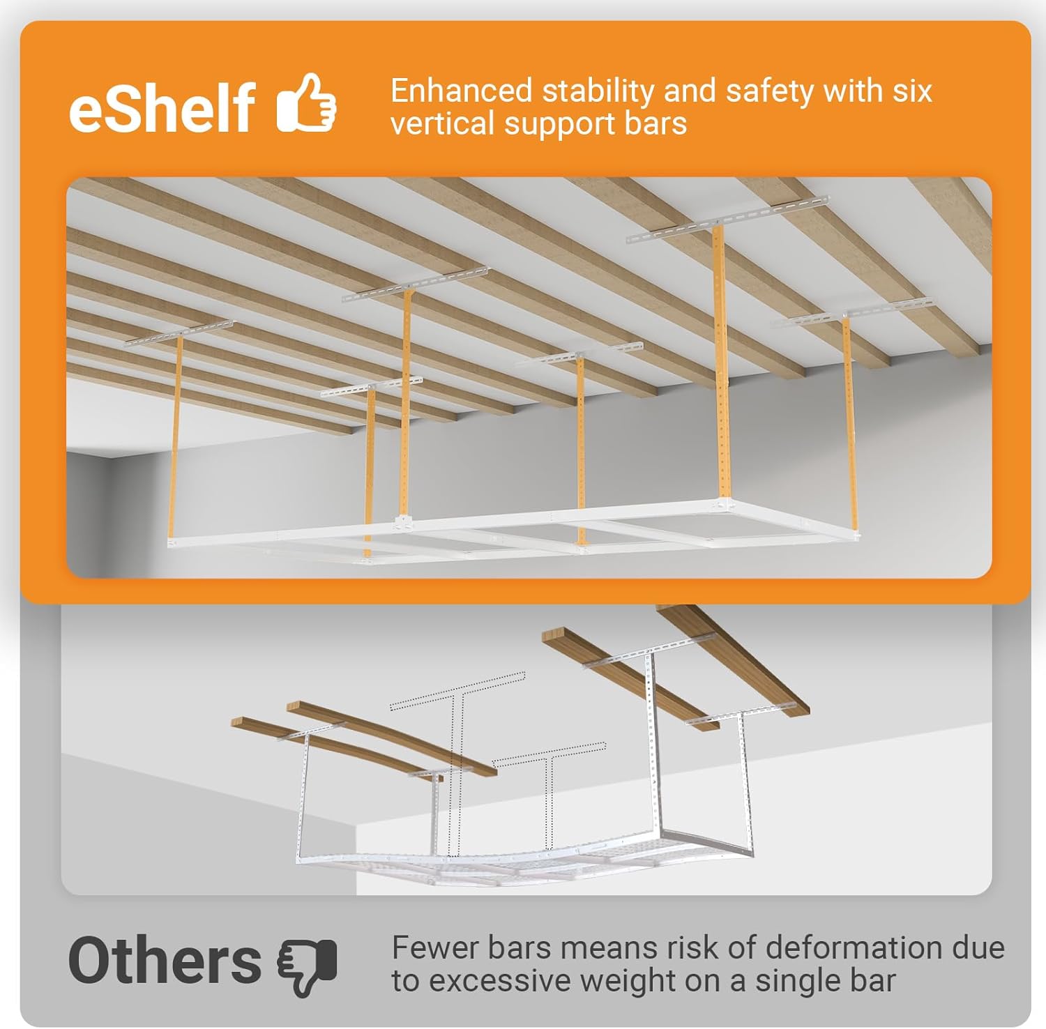 - Adjustable Height: Featuring 6 vertical support bars adjustable from 22" to 40", this rack accommodates different garage ceiling heights and items of various sizes.
