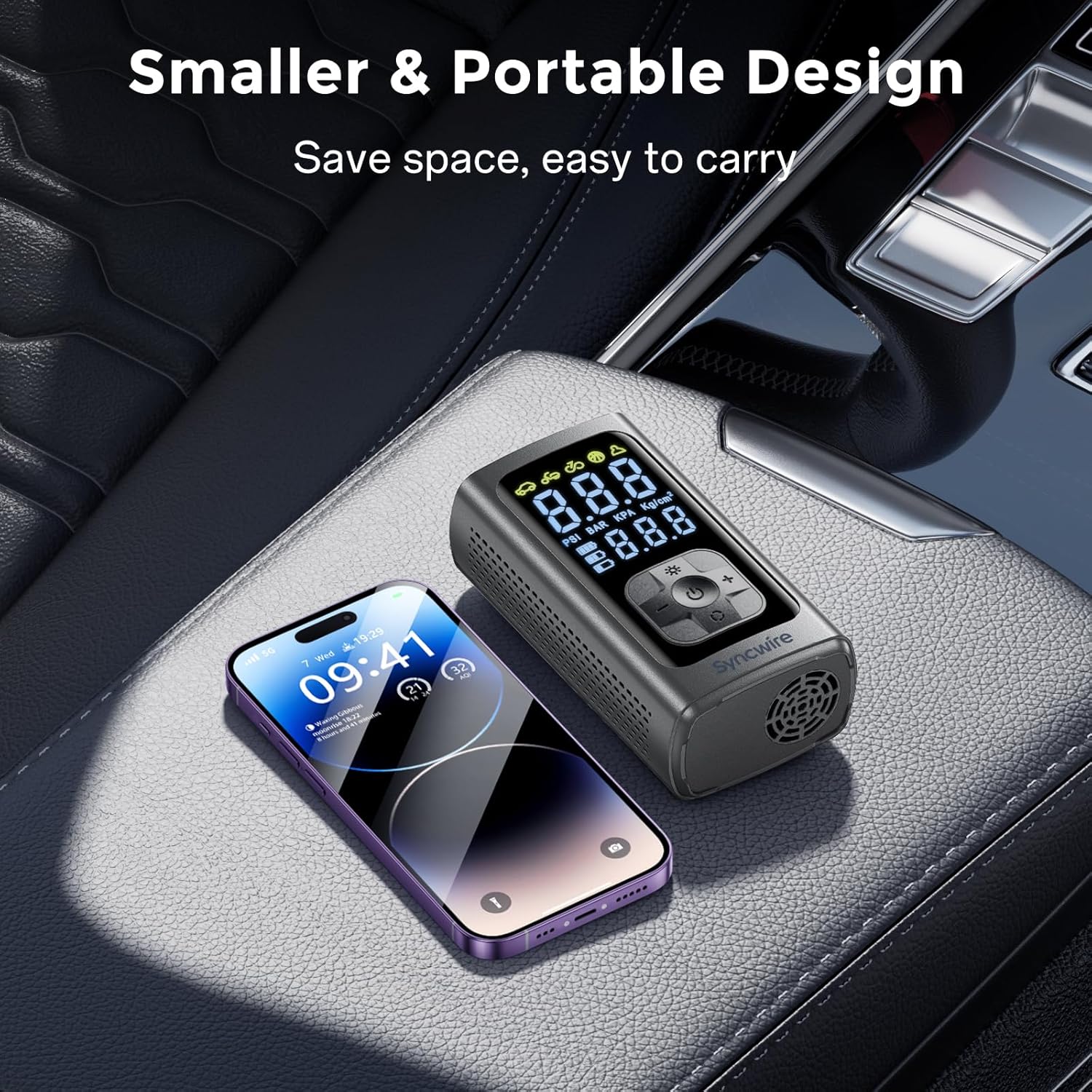 - 【2X Speedy Inflation, Smaller Size】- Syncwire portable air inflator is more smaller but inflates 2 times faster than similar competitors, capable of quickly inflating multiple car tires, bicycles, motorcycles, balls, and more in just minutes. With a rated pressure of up to 150PSI, this air pump offers strong airflow, quick speed, and compact size as a smartphone, making it the ideal choice for tire inflation.